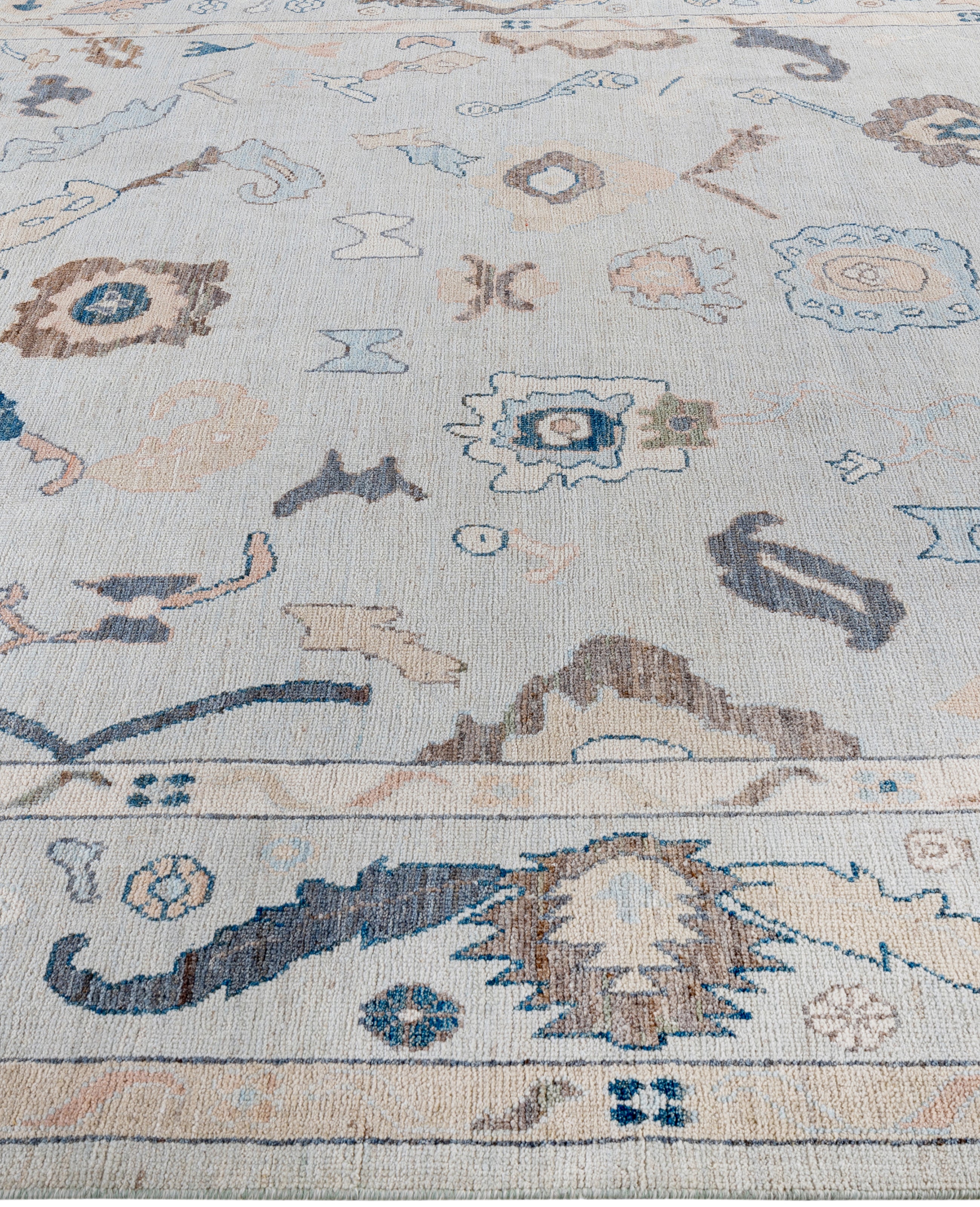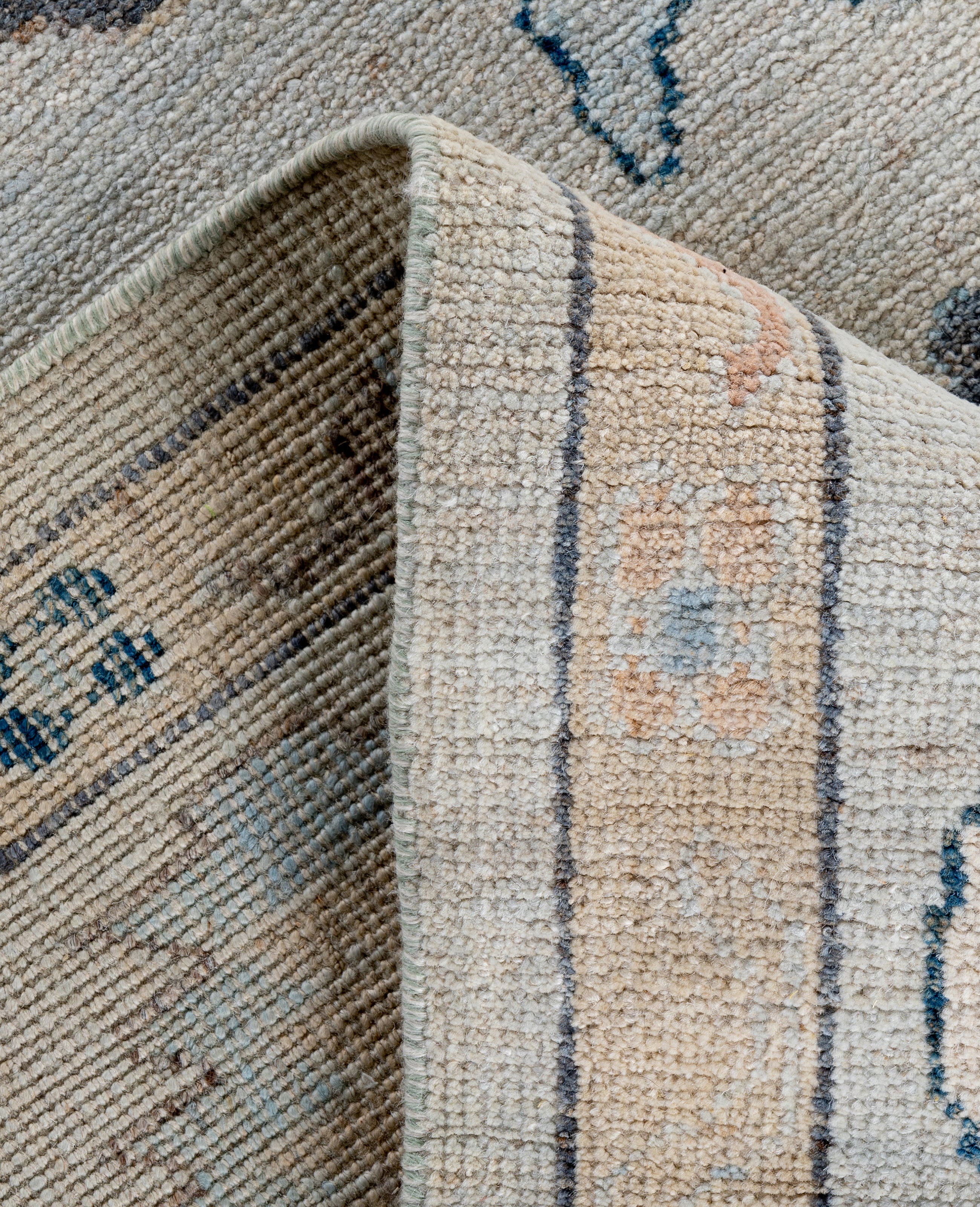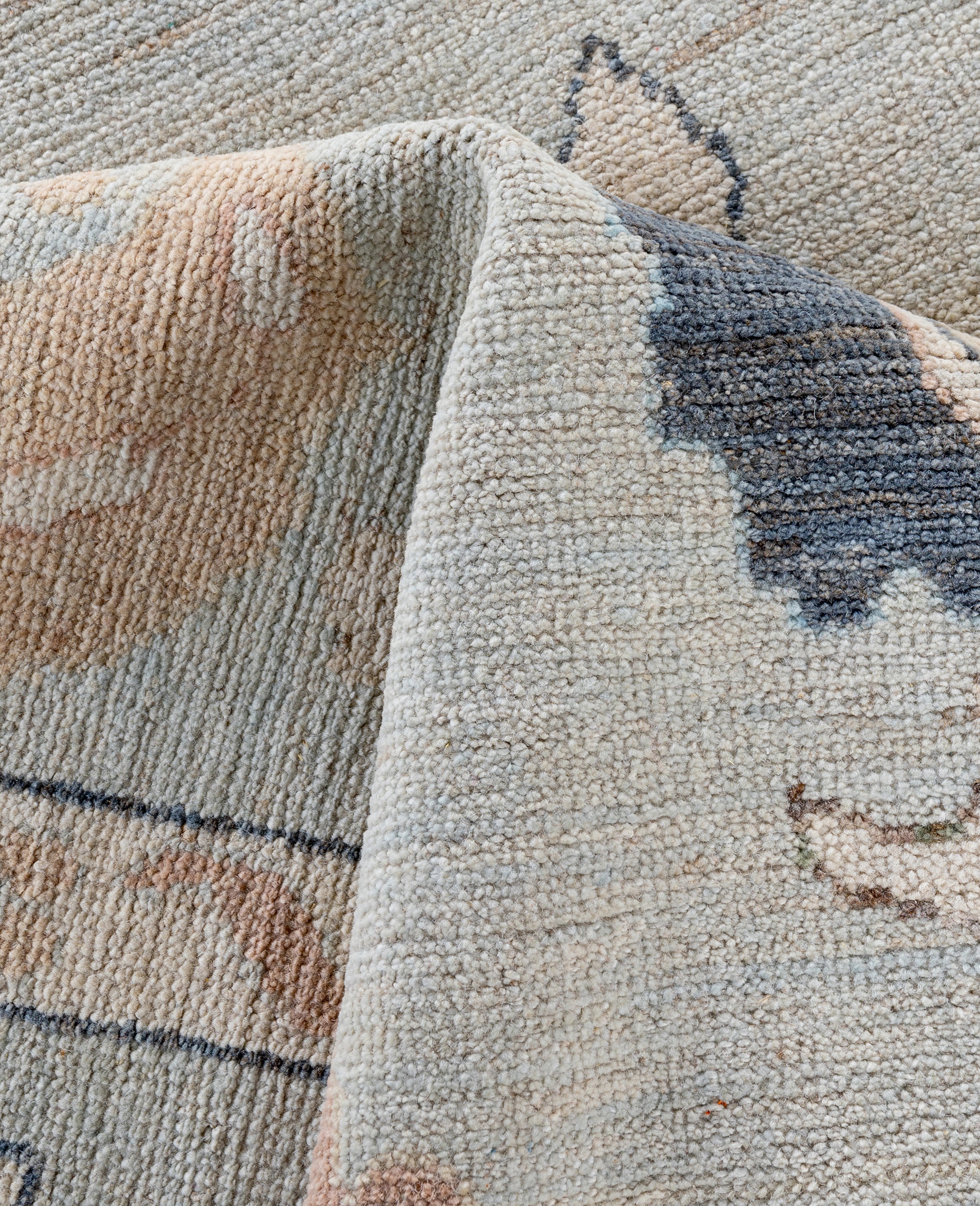 Oushak rugs are known for their soft, muted color palettes and large-scale, flowing designs. They often feature soft tones like beige, cream, gold, and light blue, with motifs that include palmettes, vines, and geometric shapes. These rugs are distinguished by their loose, open patterns, giving them an airy and elegant feel. Originating from the town of Oushak, they emphasize simplicity and a more relaxed aesthetic compared to other ornate designs. Hand-knotted using high-quality wool, Oushak rugs are celebrated for their luxurious texture and durability. Their timeless, understated beauty makes them popular in both traditional and contemporary interiors.