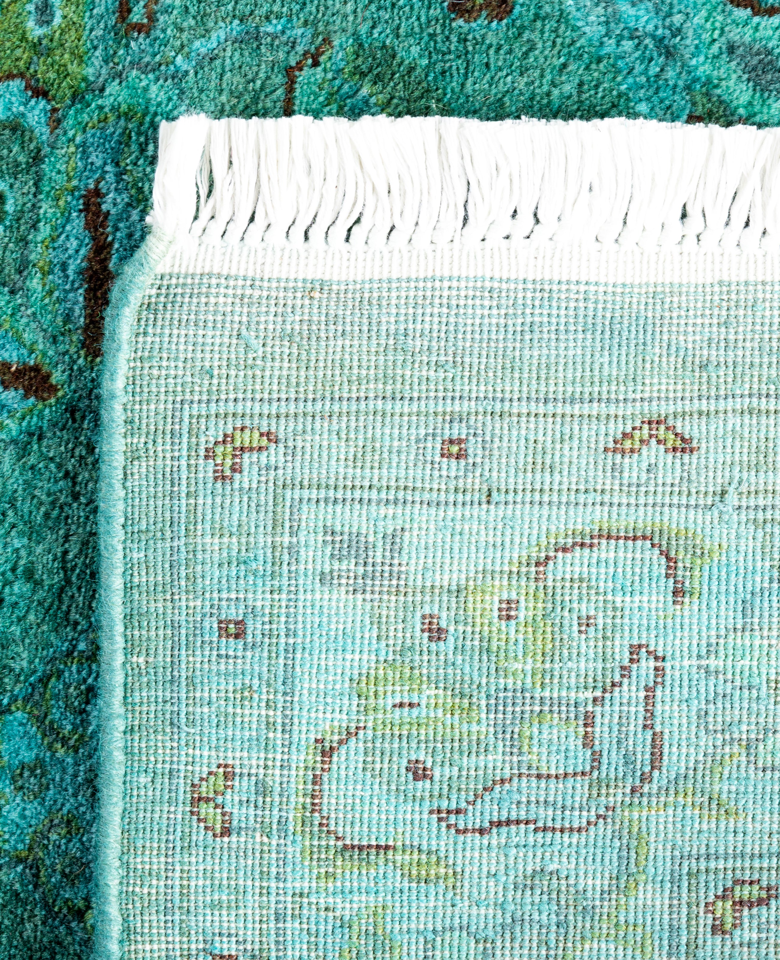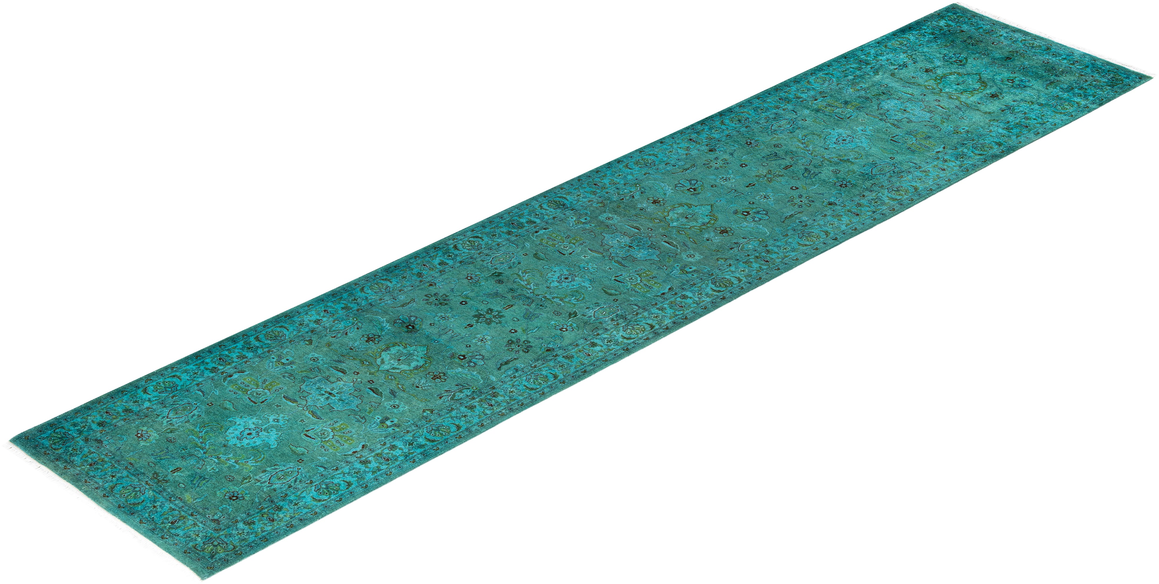 Contemporary Overdyed Wool Hand Knotted Green Runner 2' 7" x 12' 2"