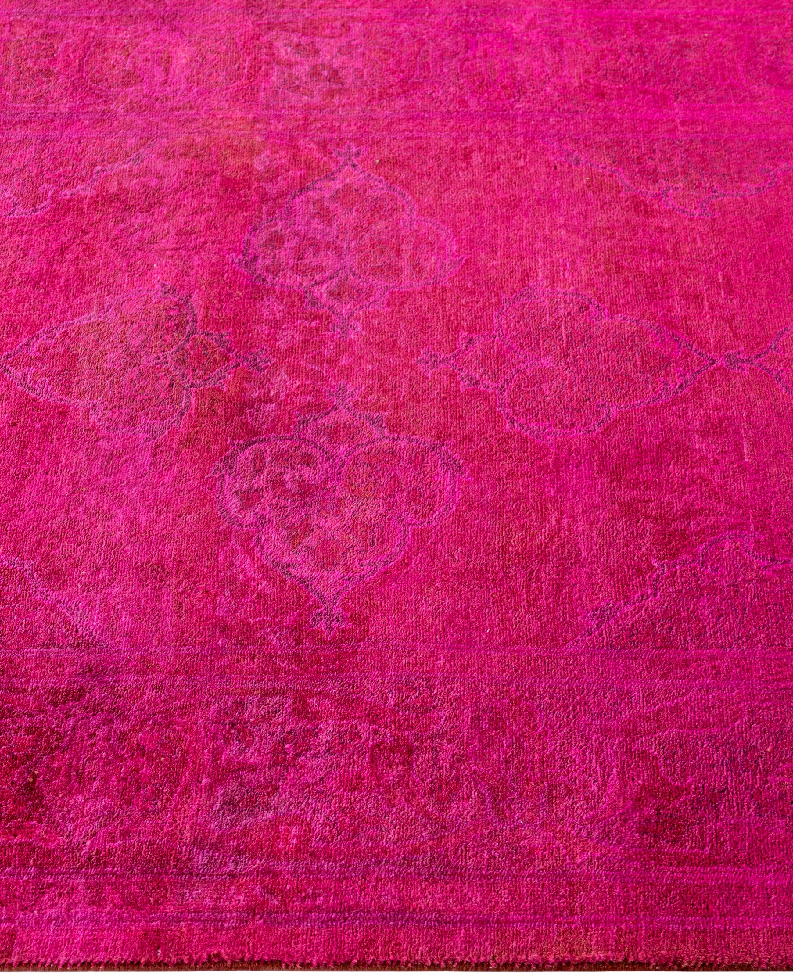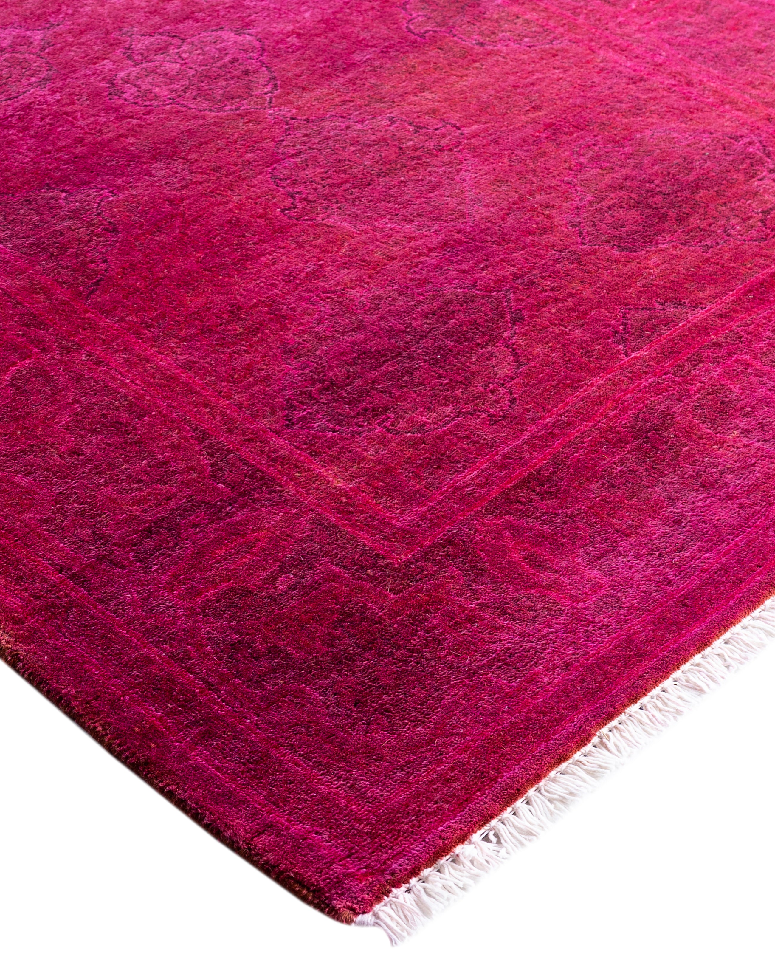 Over-dyed area rugs are created by taking vintage or traditional rugs and applying a vibrant, monochromatic dye over the existing patterns. This technique results in a bold, modern aesthetic while preserving the intricate designs beneath, blending the old with the new. The rugs are often faded and distressed before dyeing, which adds texture and depth to their appearance. The over-dye process breathes new life into worn or antique rugs, giving them a contemporary twist with rich, saturated colors like deep blues, purples, or bright reds. These rugs work well in both eclectic and modern spaces, offering a unique, artistic flair to any room. They provide a dynamic focal point, balancing between traditional craftsmanship and contemporary design trends. Over-dyed rugs are perfect for those looking to add a pop of color and character to their home decor.
