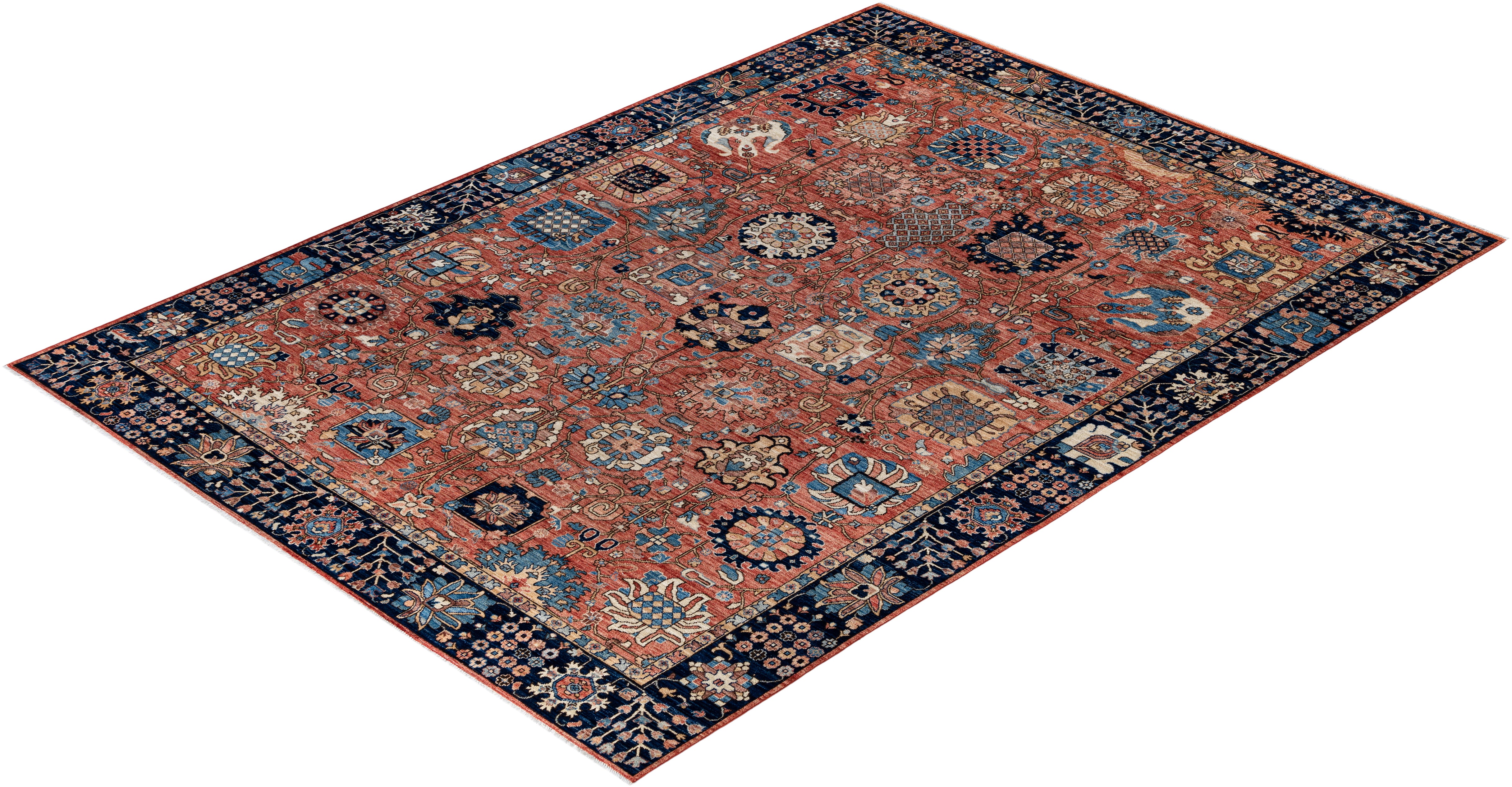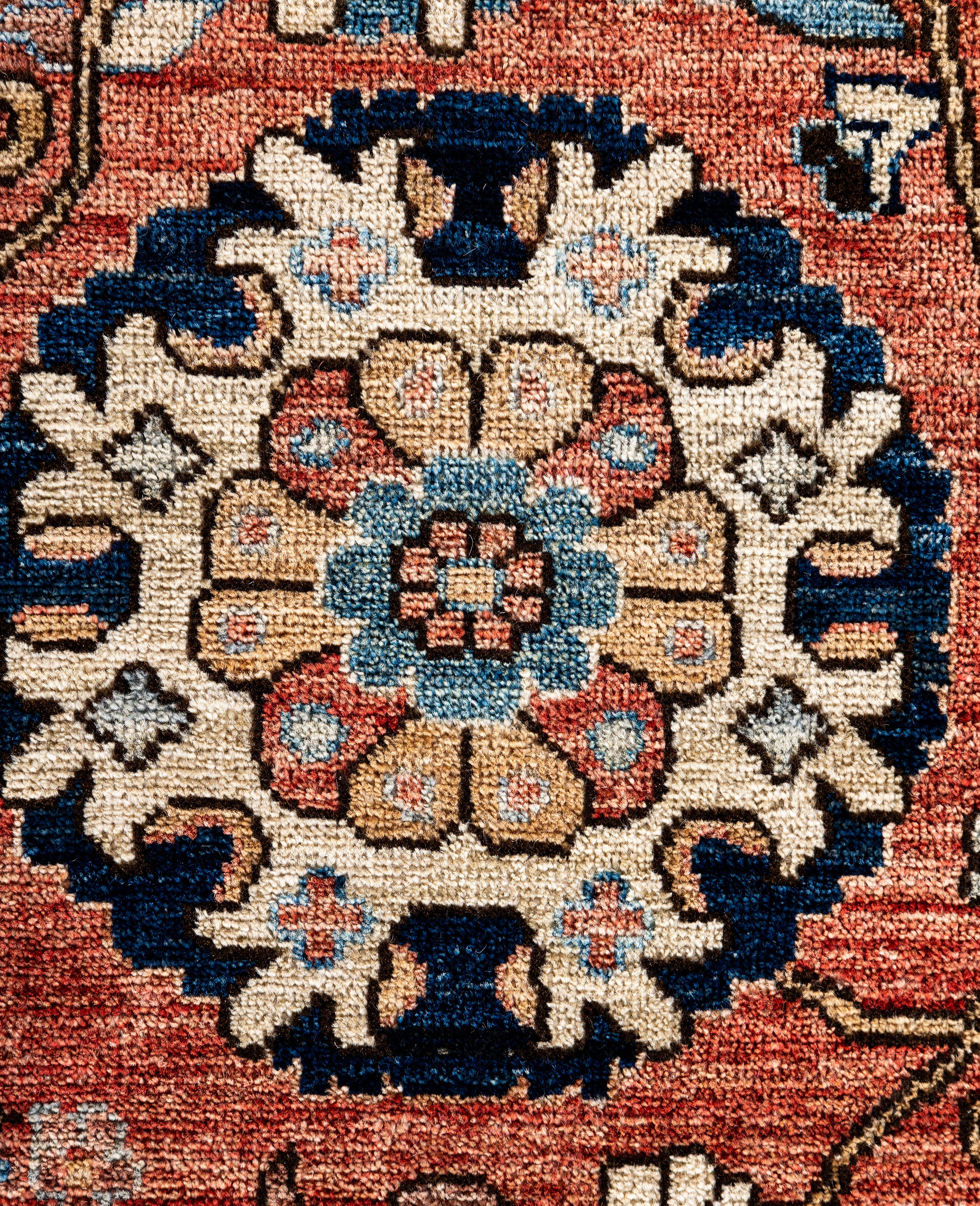 Serapi rugs are known for their bold, geometric designs and rich colors, often featuring a central medallion surrounded by intricate patterns. They typically use a warm, earthy color palette with deep reds, blues, ivory, and occasional greens. The designs emphasize large-scale motifs, including angular vines, leaves, and floral elements, giving the rugs a distinctive, almost architectural appearance. These rugs are hand-knotted and are prized for their durability and high-quality craftsmanship. Their unique aesthetic is attributed to a blend of traditional motifs with more refined, spacious compositions. They are highly sought after by collectors and interior designers for their elegance and timeless appeal.