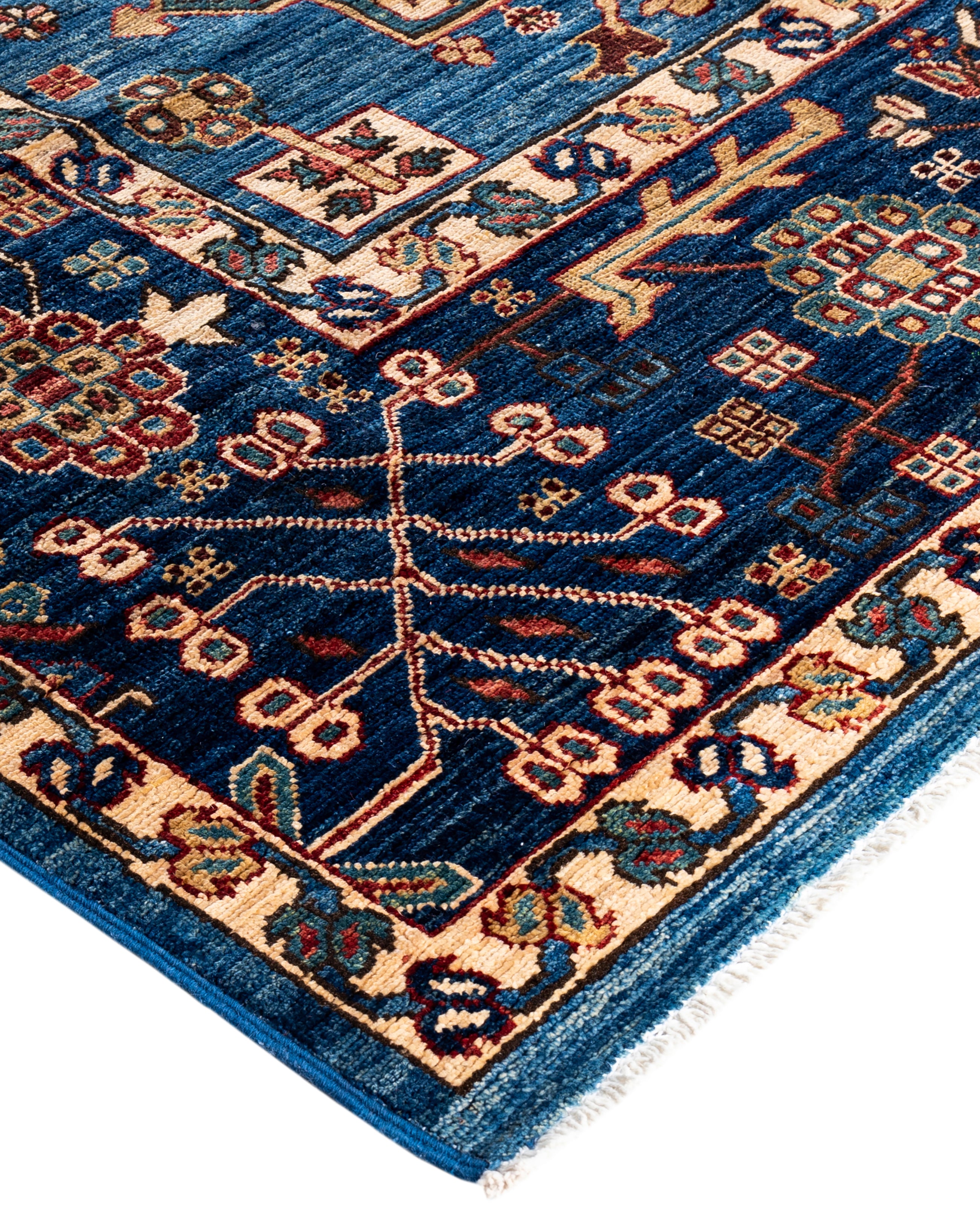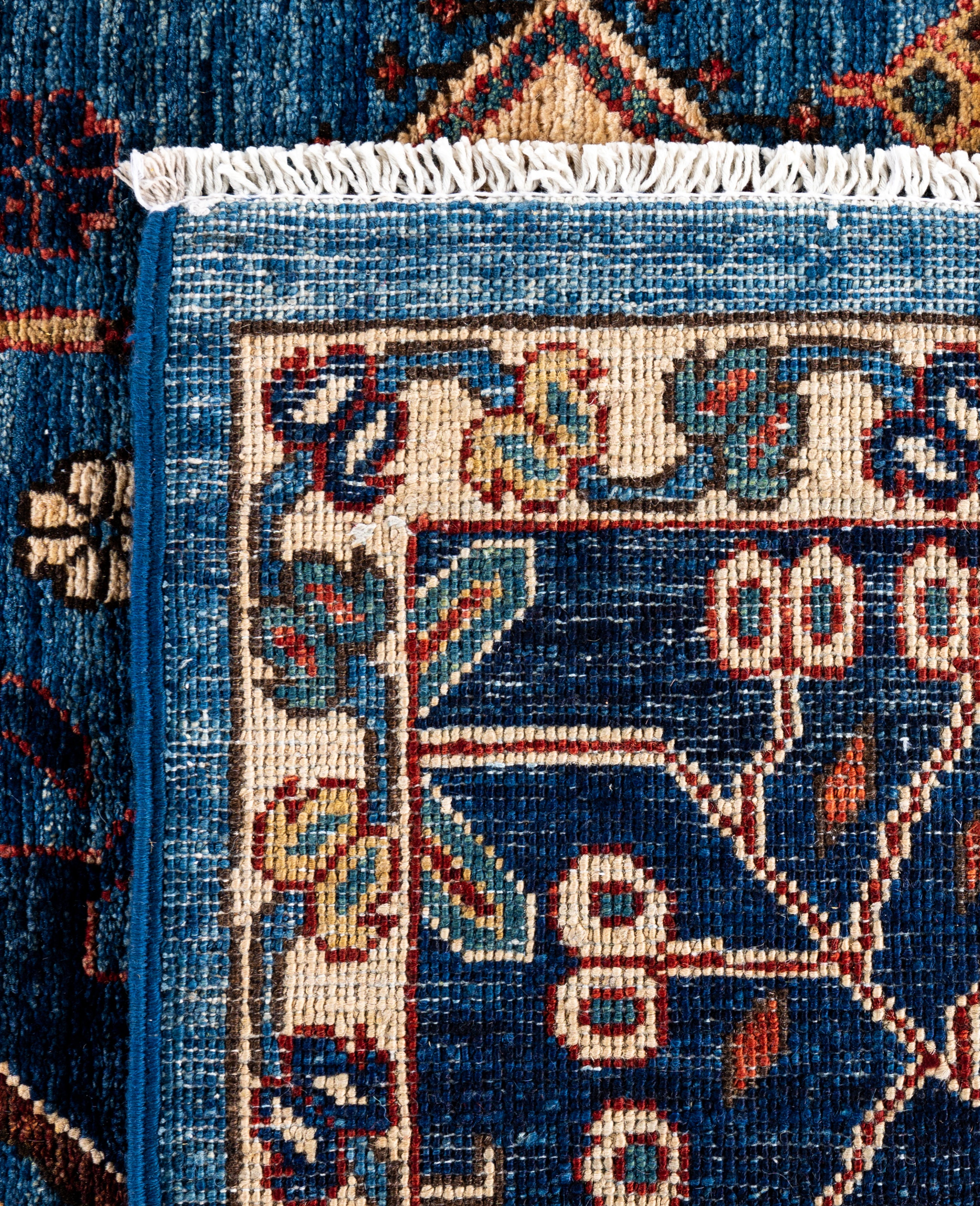 Serapi rugs are known for their bold, geometric designs and rich colors, often featuring a central medallion surrounded by intricate patterns. They typically use a warm, earthy color palette with deep reds, blues, ivory, and occasional greens. The designs emphasize large-scale motifs, including angular vines, leaves, and floral elements, giving the rugs a distinctive, almost architectural appearance. These rugs are hand-knotted and are prized for their durability and high-quality craftsmanship. Their unique aesthetic is attributed to a blend of traditional motifs with more refined, spacious compositions. They are highly sought after by collectors and interior designers for their elegance and timeless appeal.