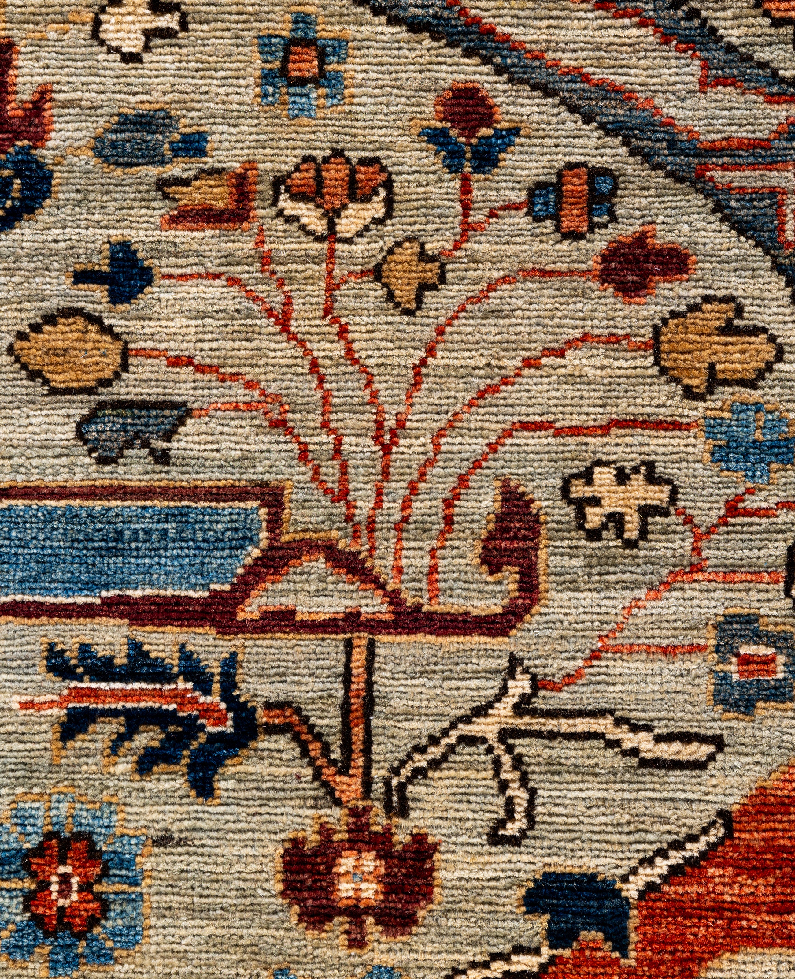 Serapi rugs are known for their bold, geometric designs and rich colors, often featuring a central medallion surrounded by intricate patterns. They typically use a warm, earthy color palette with deep reds, blues, ivory, and occasional greens. The designs emphasize large-scale motifs, including angular vines, leaves, and floral elements, giving the rugs a distinctive, almost architectural appearance. These rugs are hand-knotted and are prized for their durability and high-quality craftsmanship. Their unique aesthetic is attributed to a blend of traditional motifs with more refined, spacious compositions. They are highly sought after by collectors and interior designers for their elegance and timeless appeal.