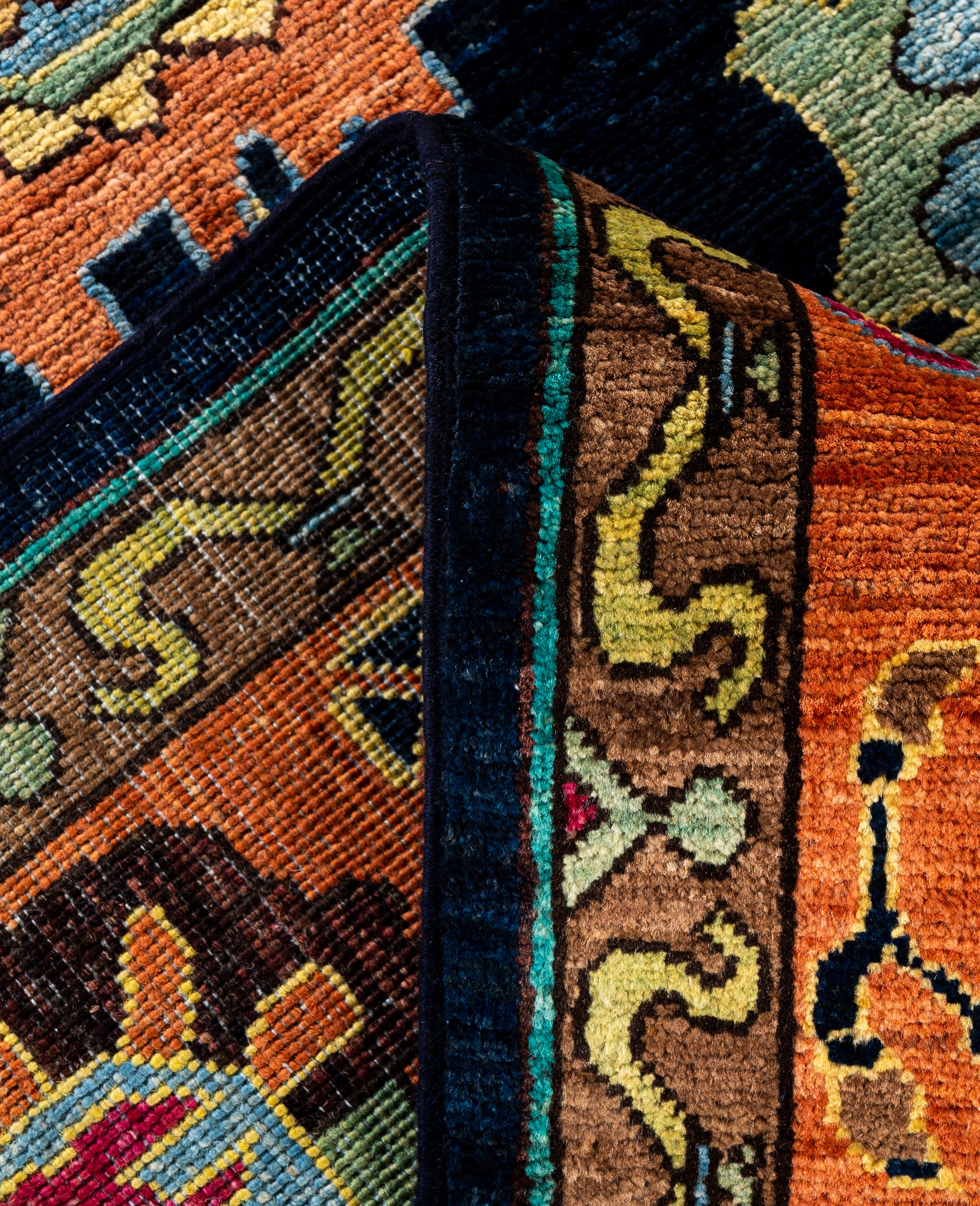 Serapi rugs are known for their bold, geometric designs and rich colors, often featuring a central medallion surrounded by intricate patterns. They typically use a warm, earthy color palette with deep reds, blues, ivory, and occasional greens. The designs emphasize large-scale motifs, including angular vines, leaves, and floral elements, giving the rugs a distinctive, almost architectural appearance. These rugs are hand-knotted and are prized for their durability and high-quality craftsmanship. Their unique aesthetic is attributed to a blend of traditional motifs with more refined, spacious compositions. They are highly sought after by collectors and interior designers for their elegance and timeless appeal.
