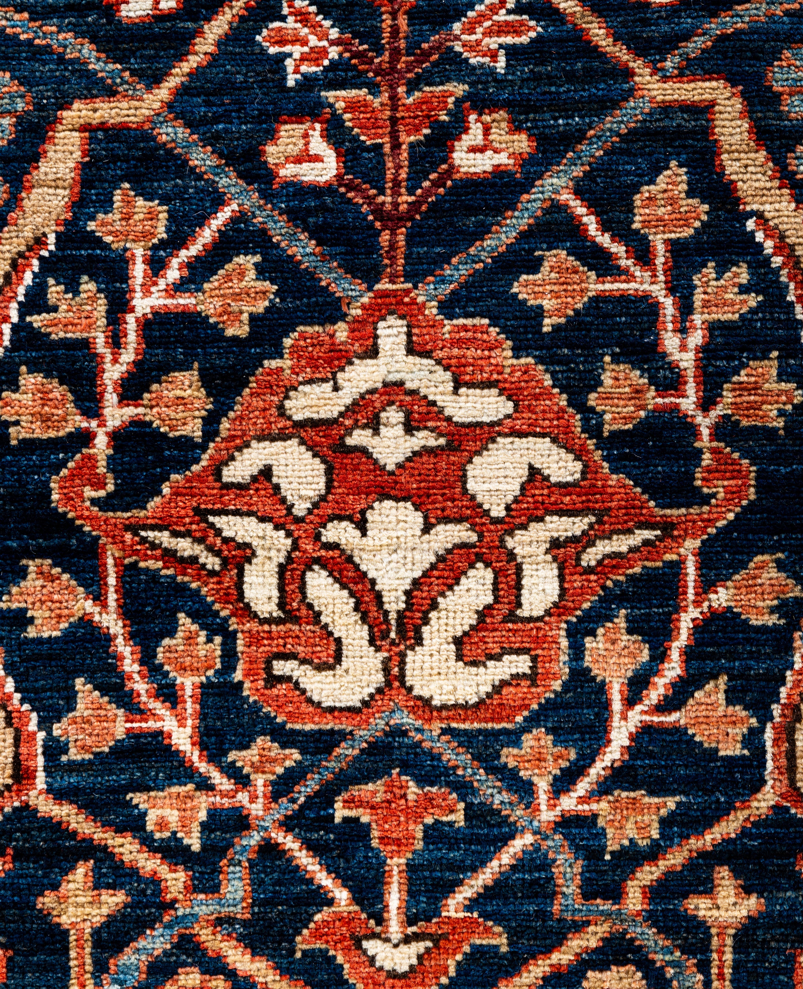 Serapi rugs are known for their bold, geometric designs and rich colors, often featuring a central medallion surrounded by intricate patterns. They typically use a warm, earthy color palette with deep reds, blues, ivory, and occasional greens. The designs emphasize large-scale motifs, including angular vines, leaves, and floral elements, giving the rugs a distinctive, almost architectural appearance. These rugs are hand-knotted and are prized for their durability and high-quality craftsmanship. Their unique aesthetic is attributed to a blend of traditional motifs with more refined, spacious compositions. They are highly sought after by collectors and interior designers for their elegance and timeless appeal.