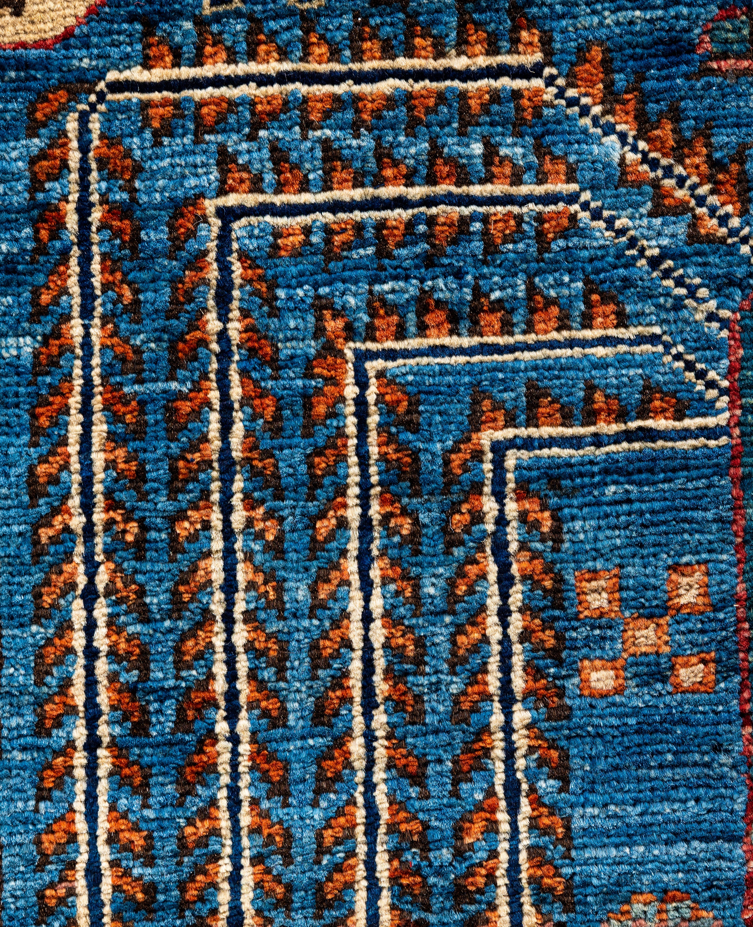 Serapi rugs are known for their bold, geometric designs and rich colors, often featuring a central medallion surrounded by intricate patterns. They typically use a warm, earthy color palette with deep reds, blues, ivory, and occasional greens. The designs emphasize large-scale motifs, including angular vines, leaves, and floral elements, giving the rugs a distinctive, almost architectural appearance. These rugs are hand-knotted and are prized for their durability and high-quality craftsmanship. Their unique aesthetic is attributed to a blend of traditional motifs with more refined, spacious compositions. They are highly sought after by collectors and interior designers for their elegance and timeless appeal.
