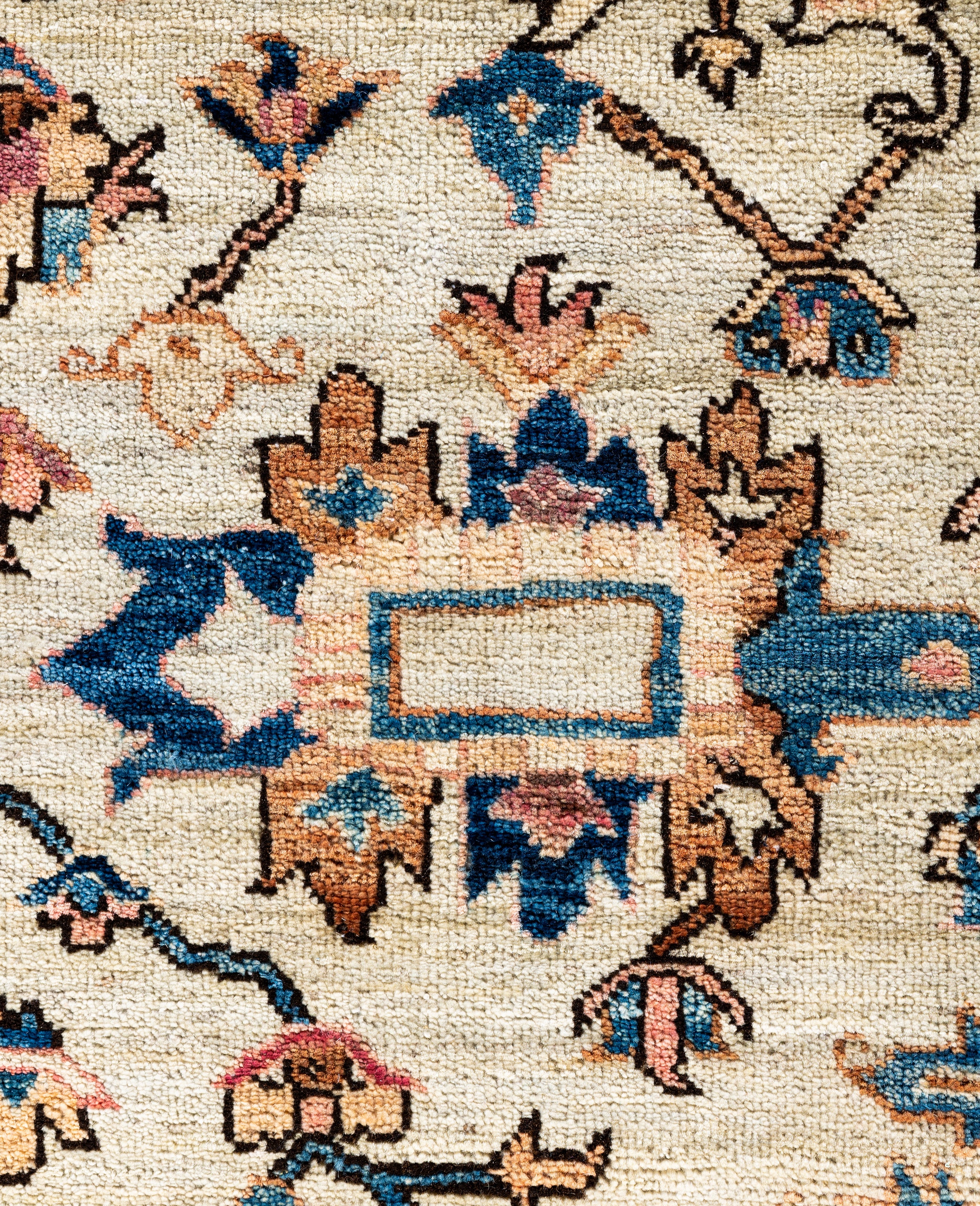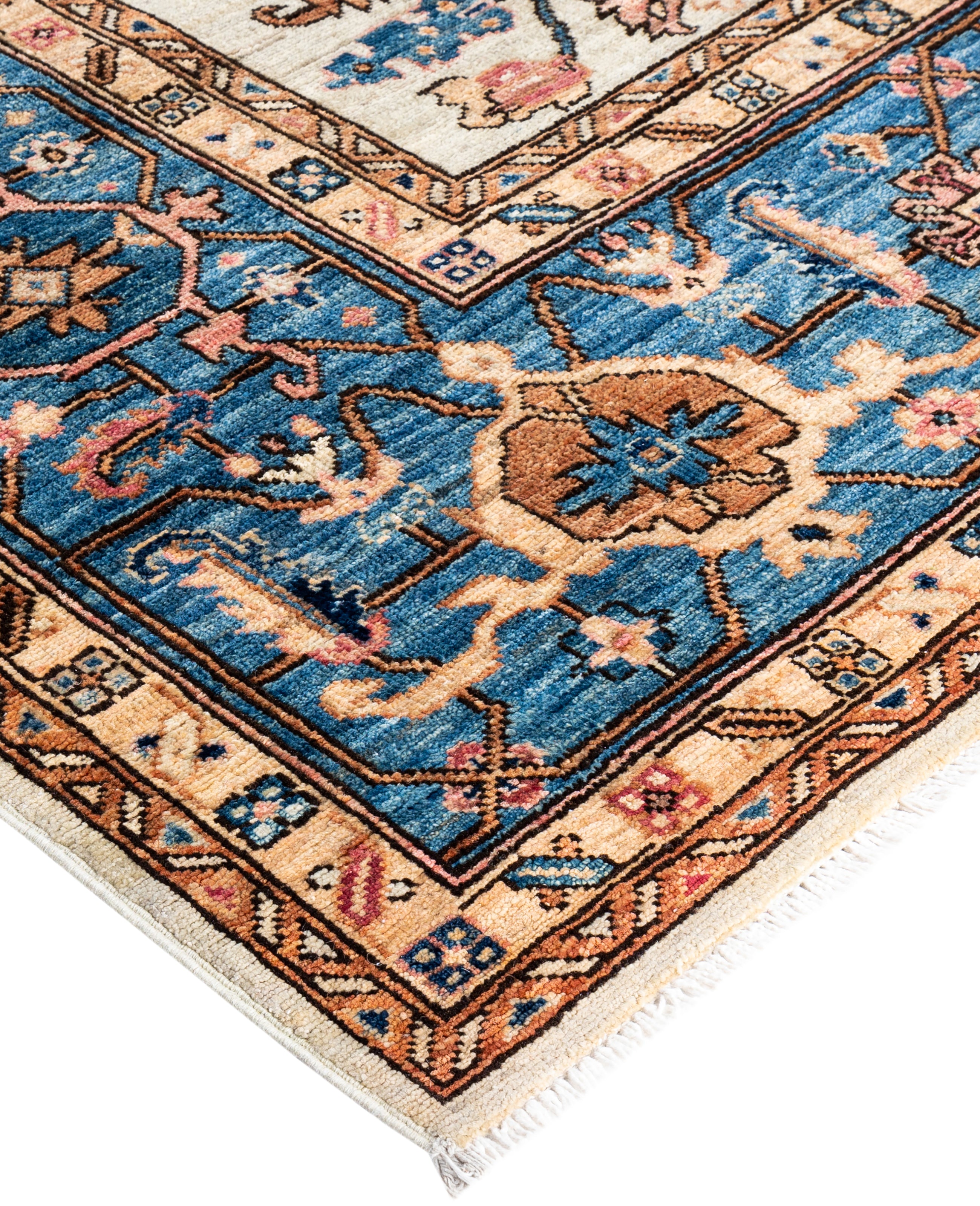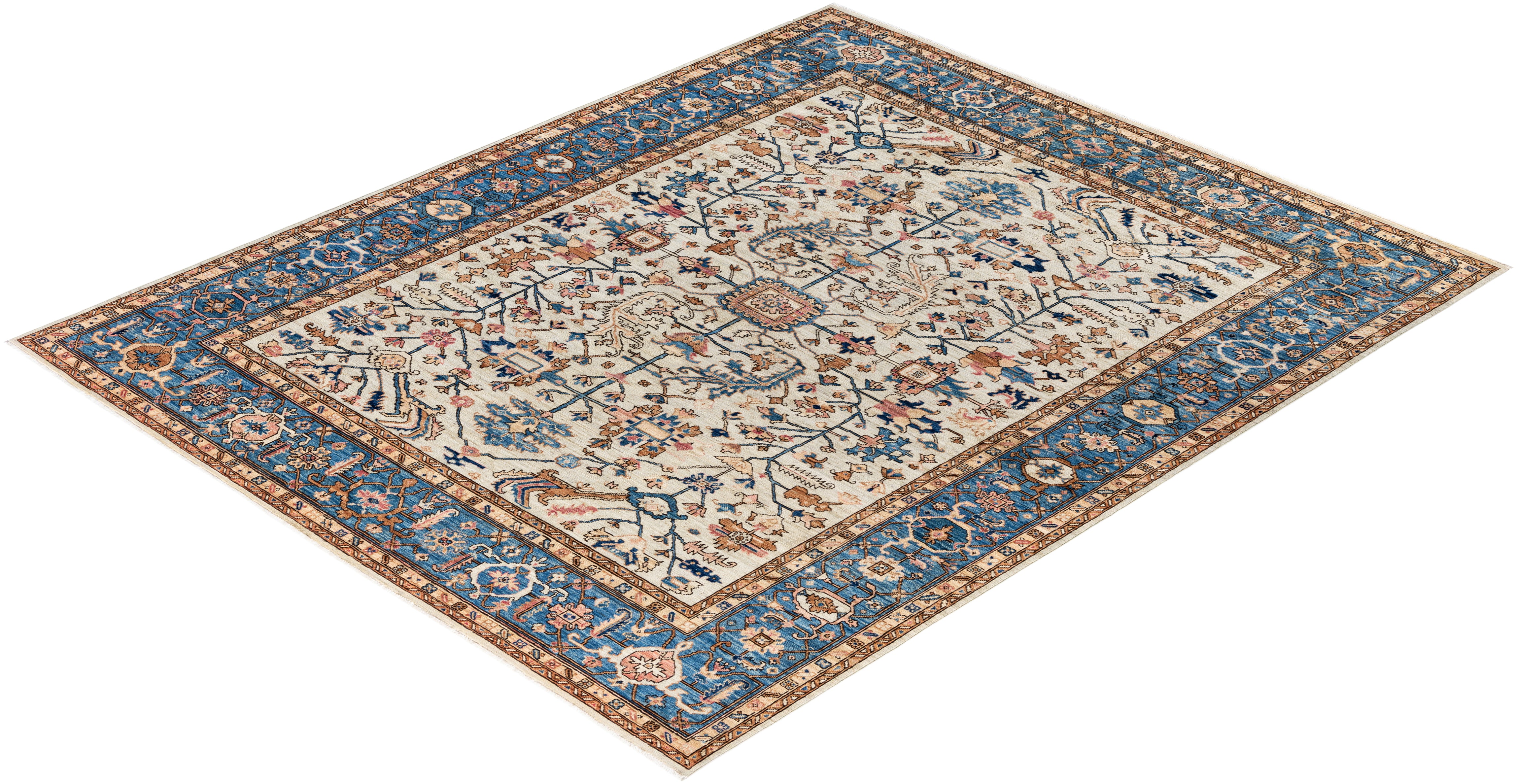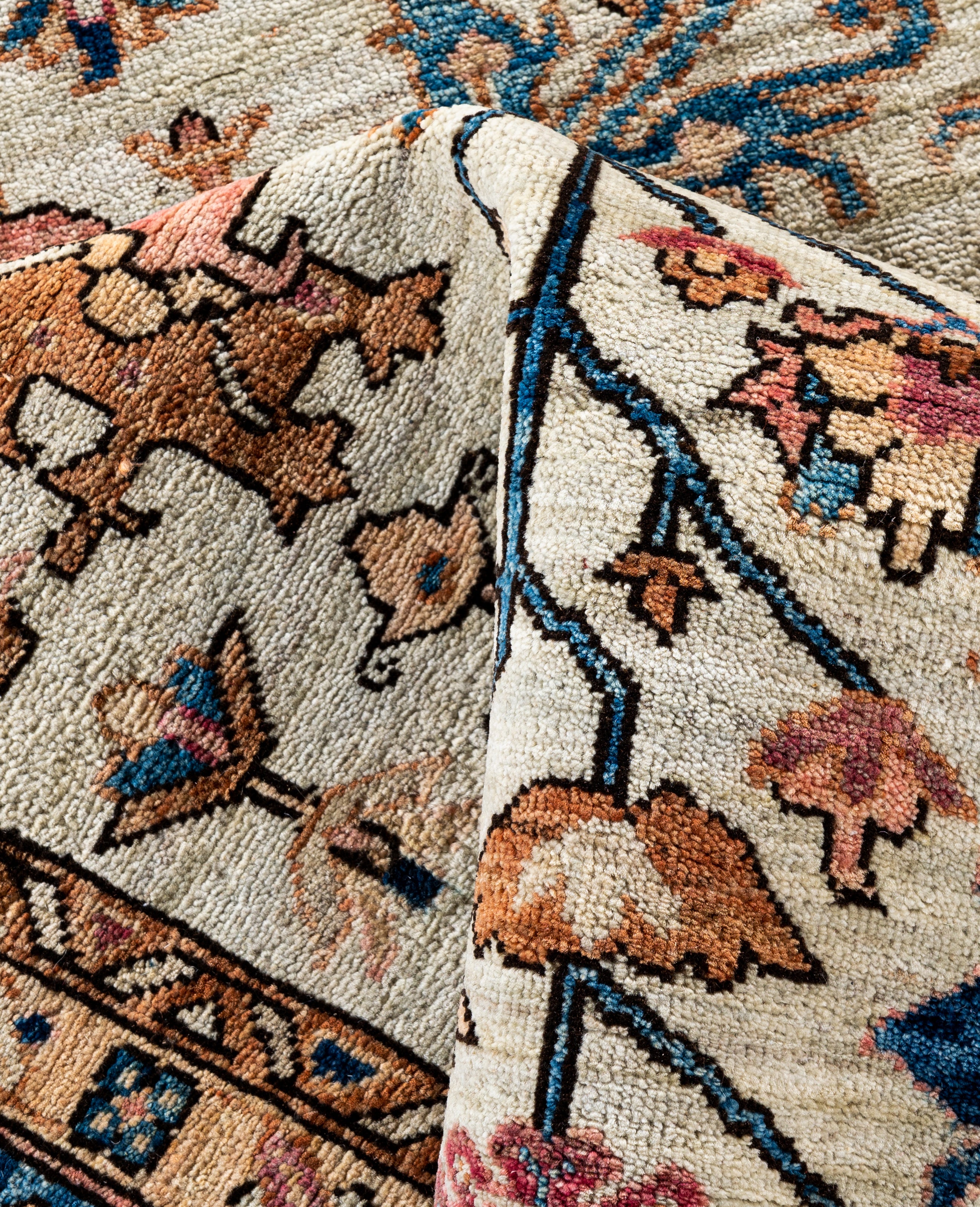 Serapi rugs are known for their bold, geometric designs and rich colors, often featuring a central medallion surrounded by intricate patterns. They typically use a warm, earthy color palette with deep reds, blues, ivory, and occasional greens. The designs emphasize large-scale motifs, including angular vines, leaves, and floral elements, giving the rugs a distinctive, almost architectural appearance. These rugs are hand-knotted and are prized for their durability and high-quality craftsmanship. Their unique aesthetic is attributed to a blend of traditional motifs with more refined, spacious compositions. They are highly sought after by collectors and interior designers for their elegance and timeless appeal.