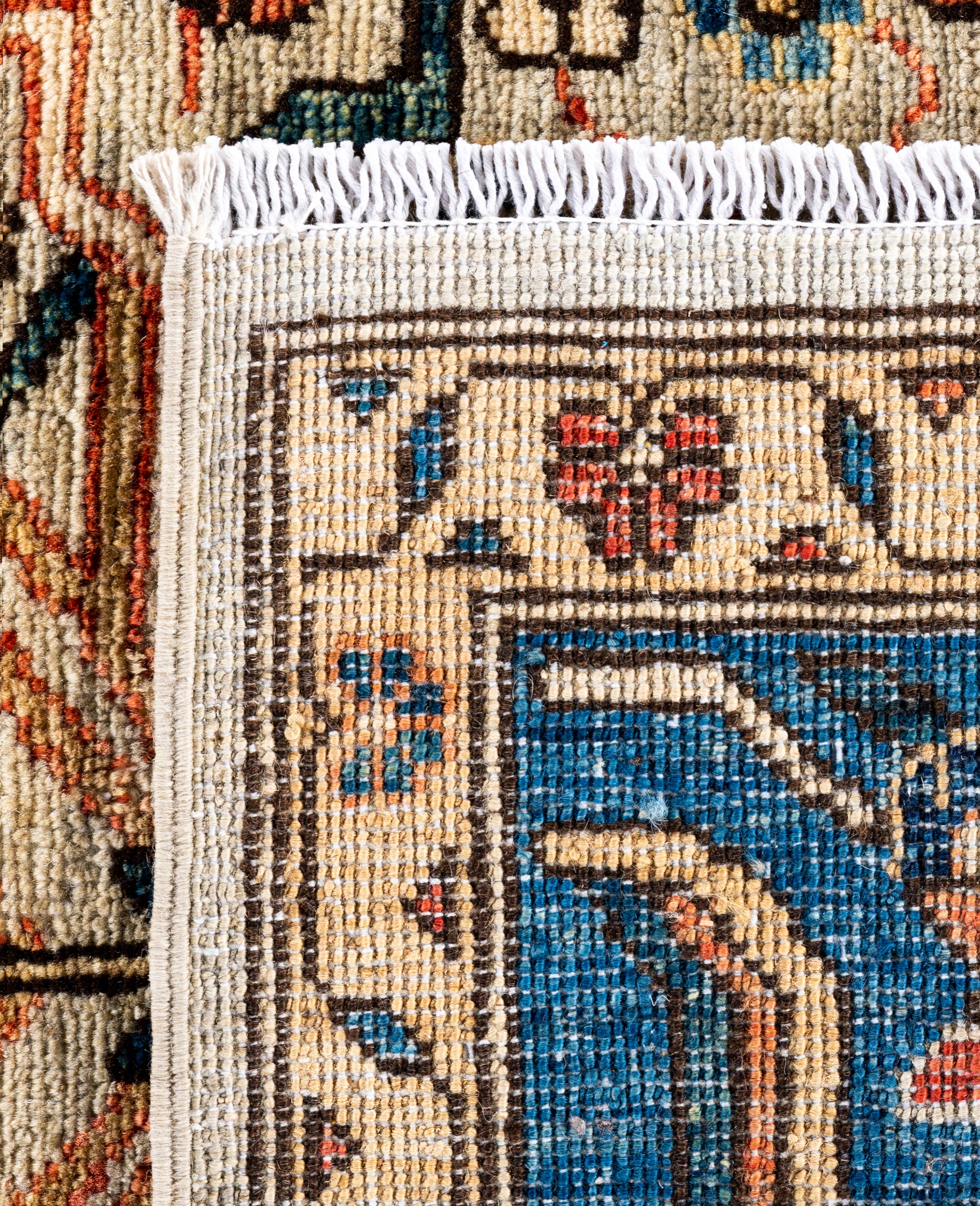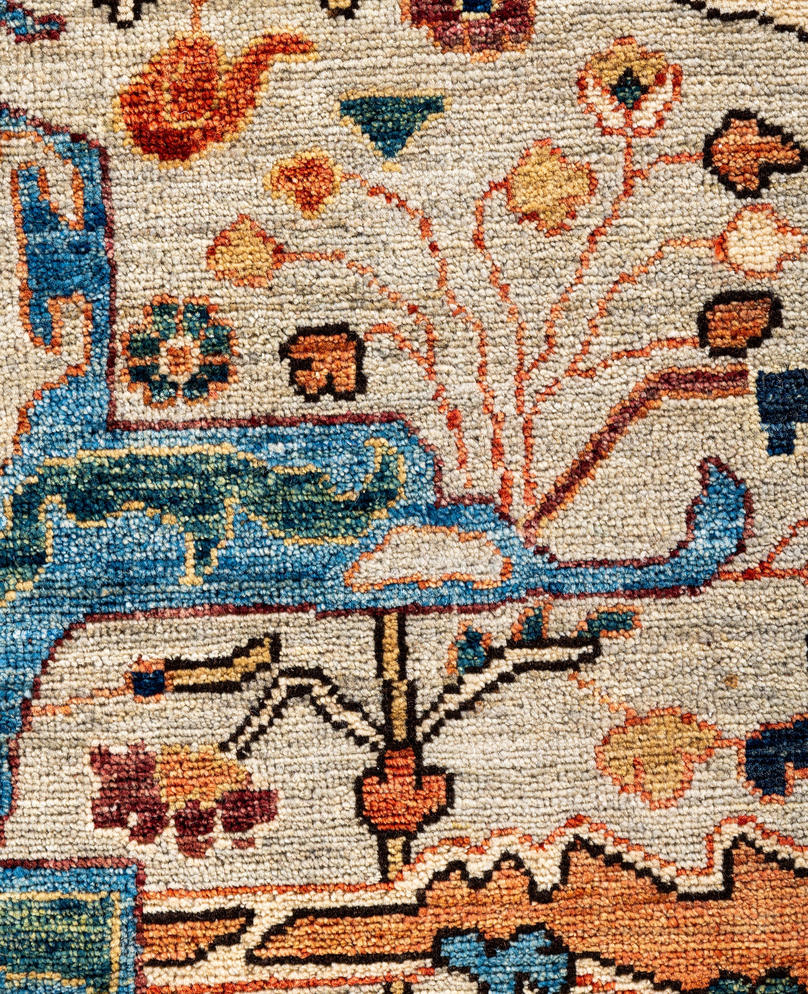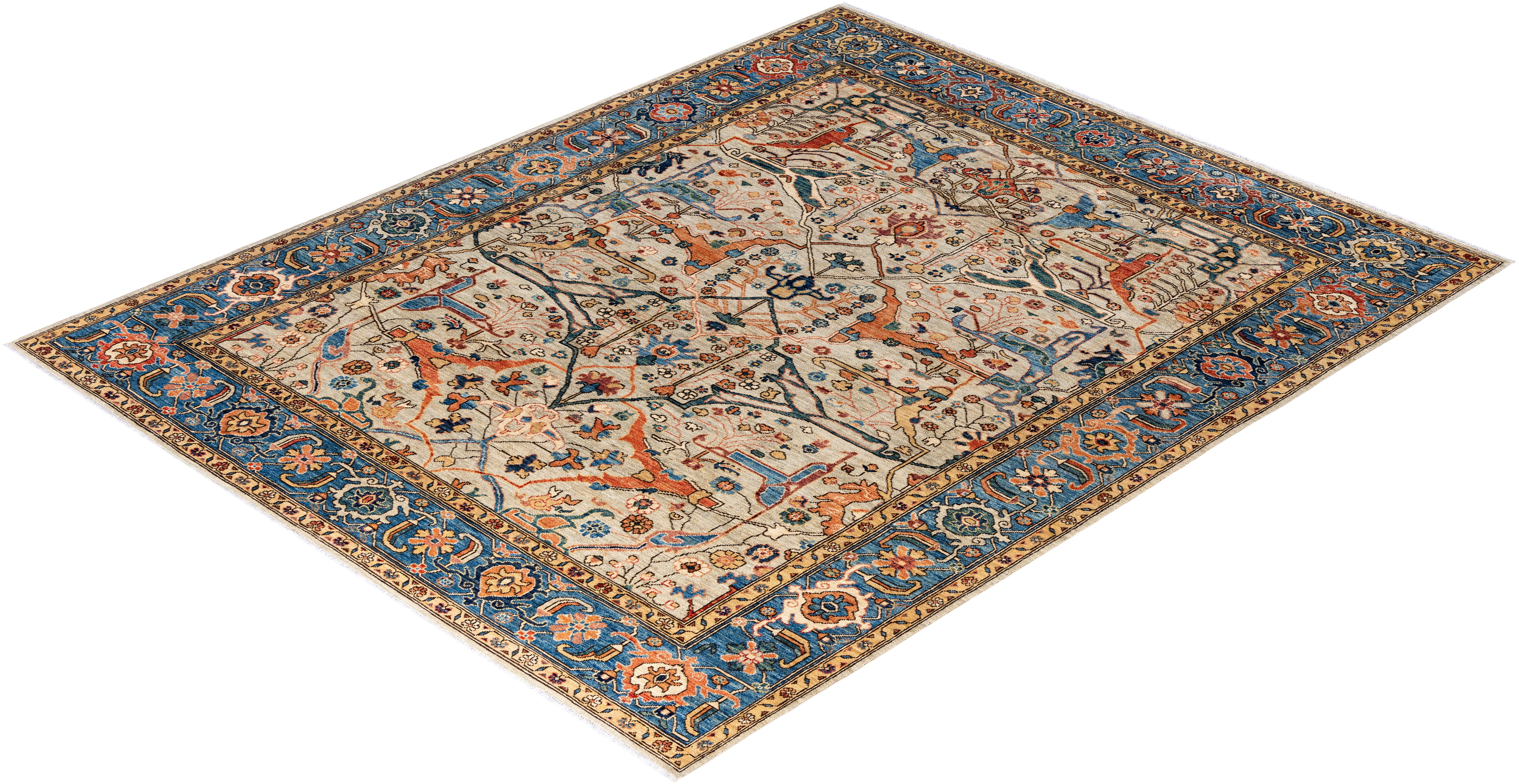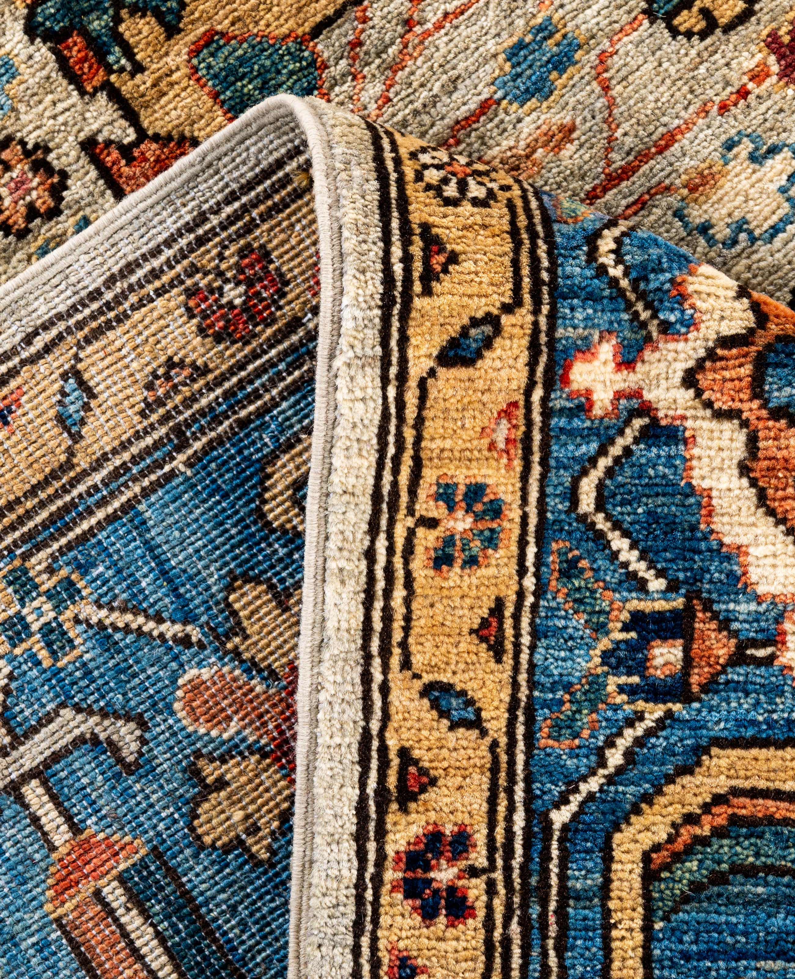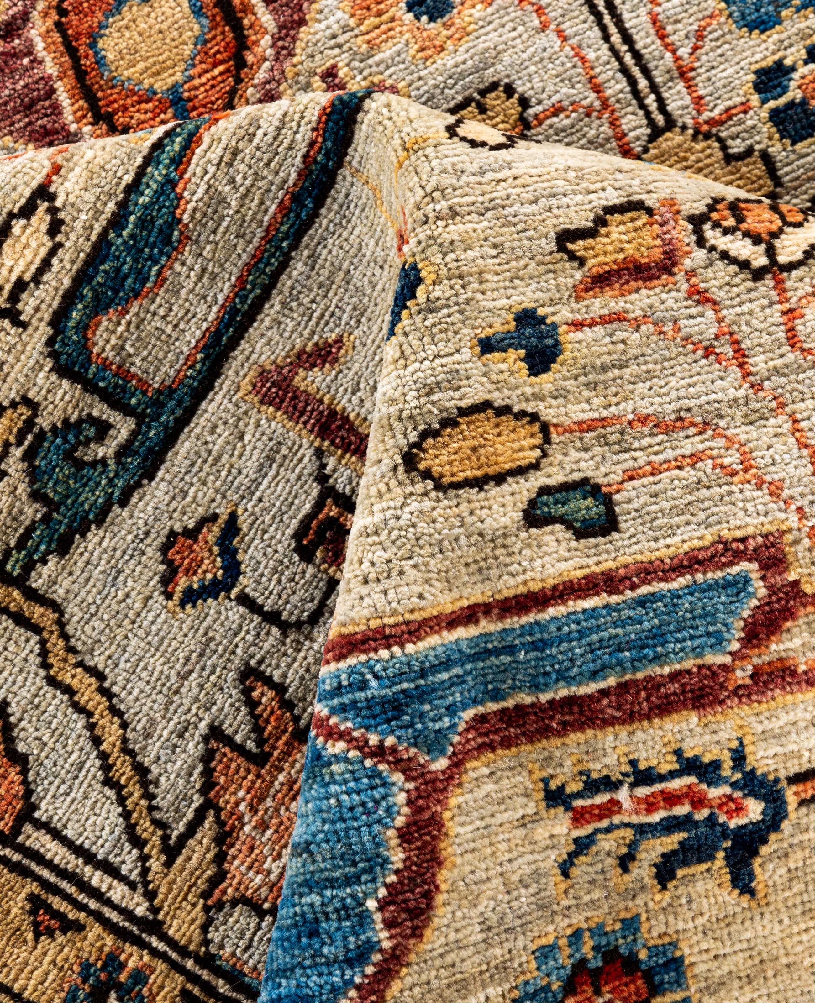 Serapi rugs are known for their bold, geometric designs and rich colors, often featuring a central medallion surrounded by intricate patterns. They typically use a warm, earthy color palette with deep reds, blues, ivory, and occasional greens. The designs emphasize large-scale motifs, including angular vines, leaves, and floral elements, giving the rugs a distinctive, almost architectural appearance. These rugs are hand-knotted and are prized for their durability and high-quality craftsmanship. Their unique aesthetic is attributed to a blend of traditional motifs with more refined, spacious compositions. They are highly sought after by collectors and interior designers for their elegance and timeless appeal.