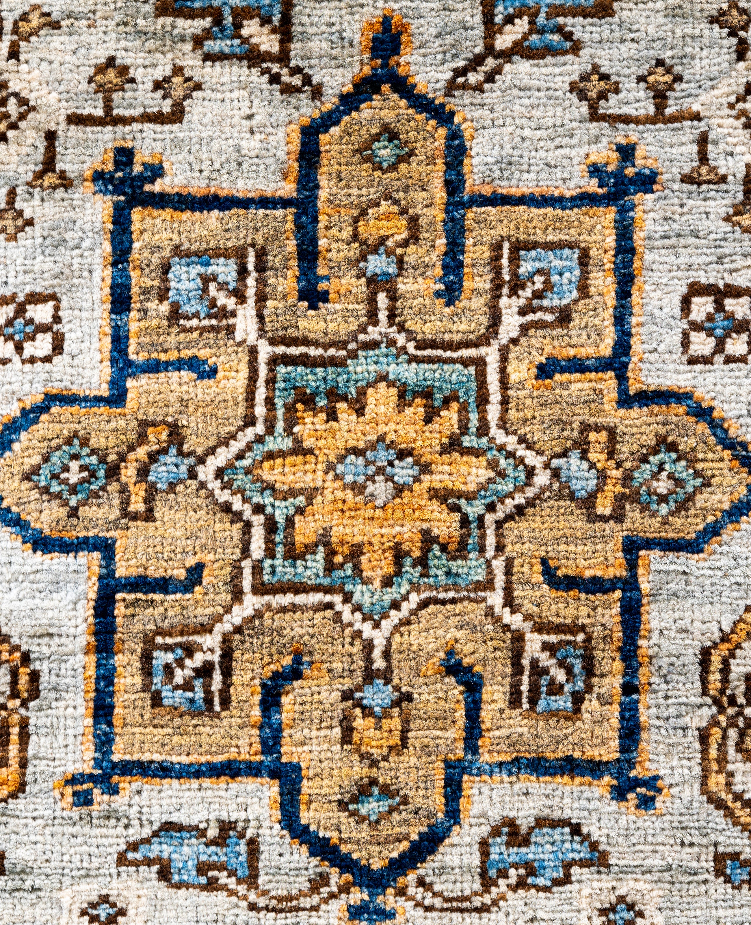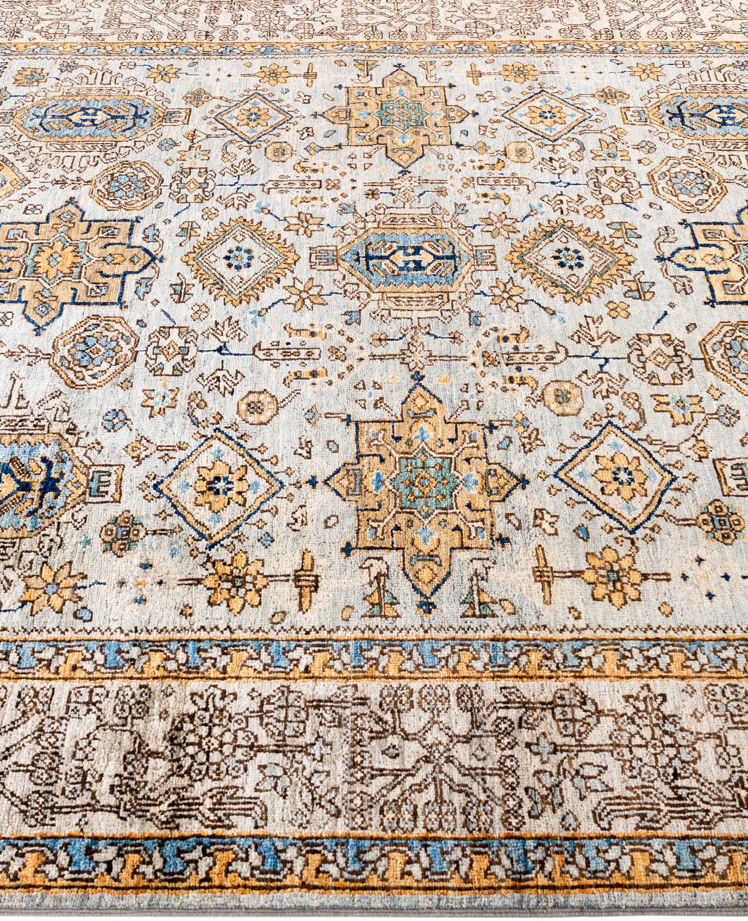 Serapi rugs are known for their bold, geometric designs and rich colors, often featuring a central medallion surrounded by intricate patterns. They typically use a warm, earthy color palette with deep reds, blues, ivory, and occasional greens. The designs emphasize large-scale motifs, including angular vines, leaves, and floral elements, giving the rugs a distinctive, almost architectural appearance. These rugs are hand-knotted and are prized for their durability and high-quality craftsmanship. Their unique aesthetic is attributed to a blend of traditional motifs with more refined, spacious compositions. They are highly sought after by collectors and interior designers for their elegance and timeless appeal.