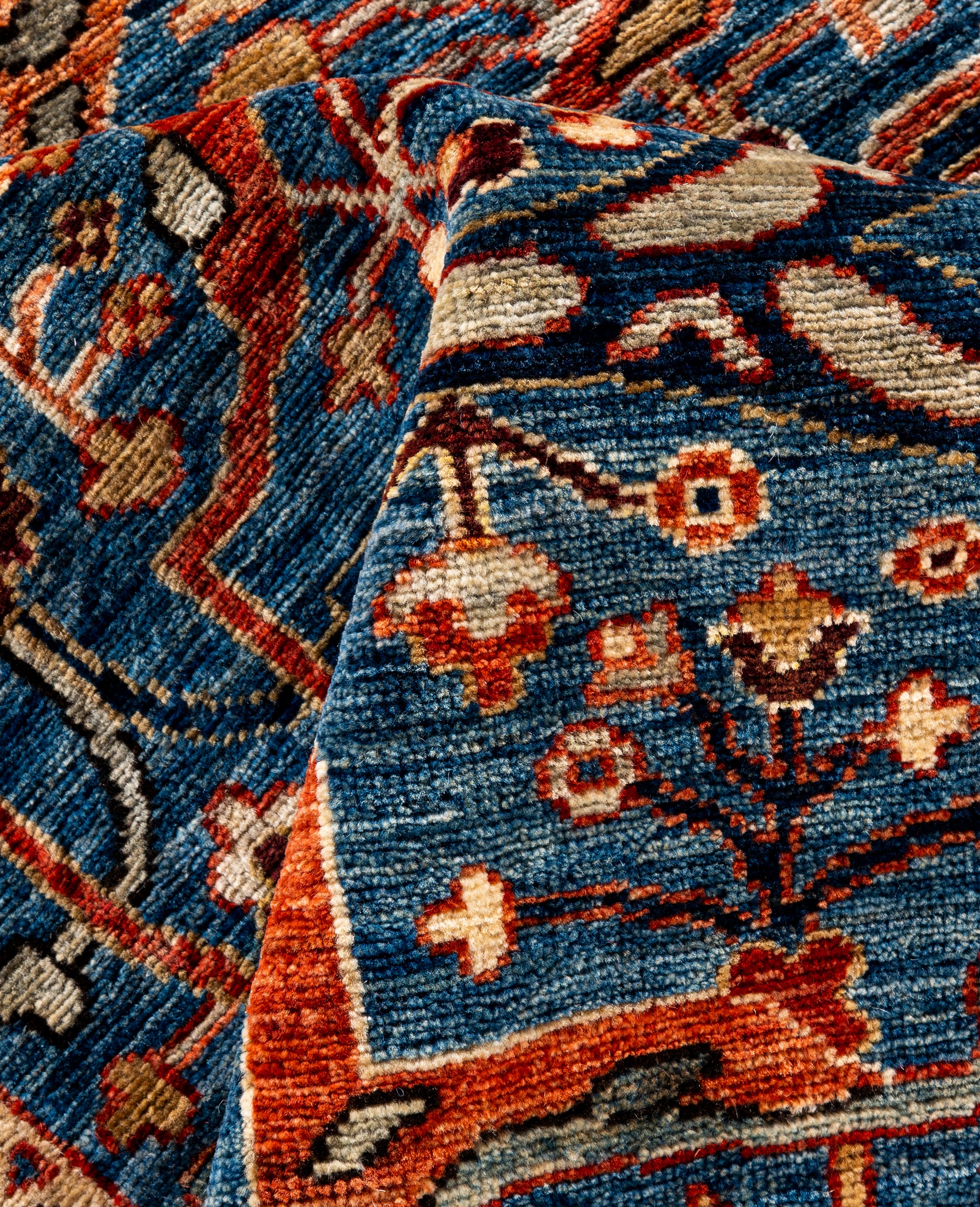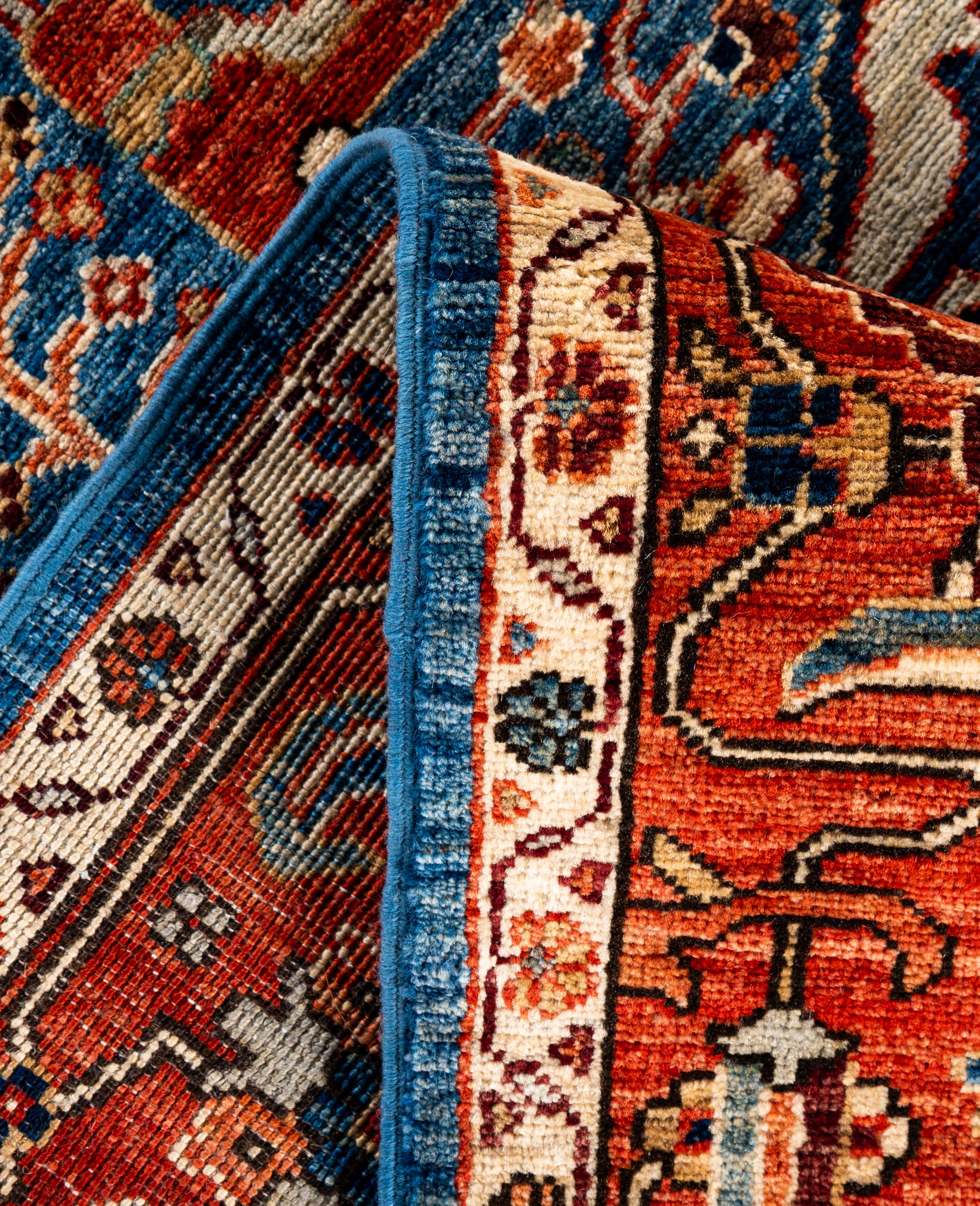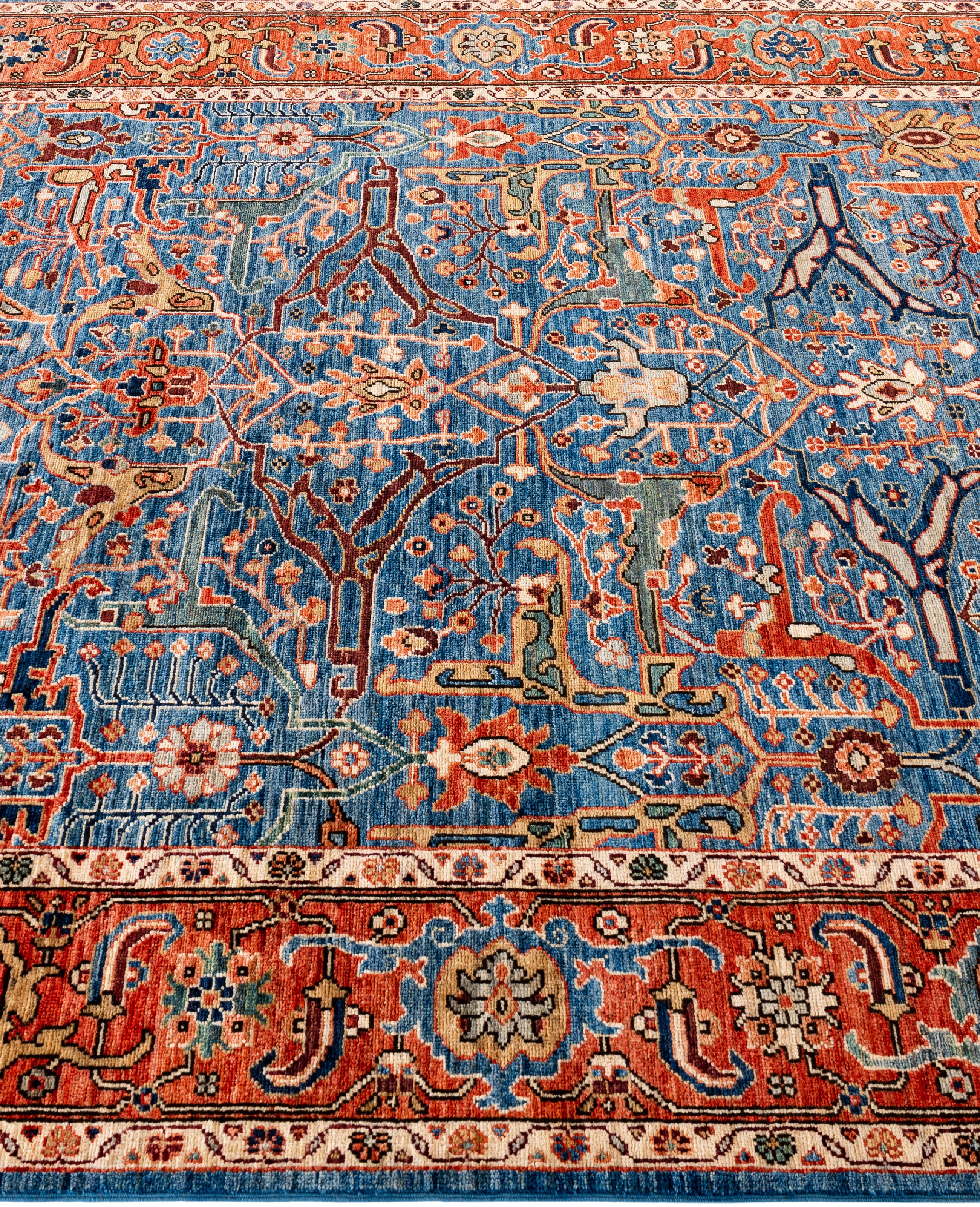 Serapi rugs are known for their bold, geometric designs and rich colors, often featuring a central medallion surrounded by intricate patterns. They typically use a warm, earthy color palette with deep reds, blues, ivory, and occasional greens. The designs emphasize large-scale motifs, including angular vines, leaves, and floral elements, giving the rugs a distinctive, almost architectural appearance. These rugs are hand-knotted and are prized for their durability and high-quality craftsmanship. Their unique aesthetic is attributed to a blend of traditional motifs with more refined, spacious compositions. They are highly sought after by collectors and interior designers for their elegance and timeless appeal.