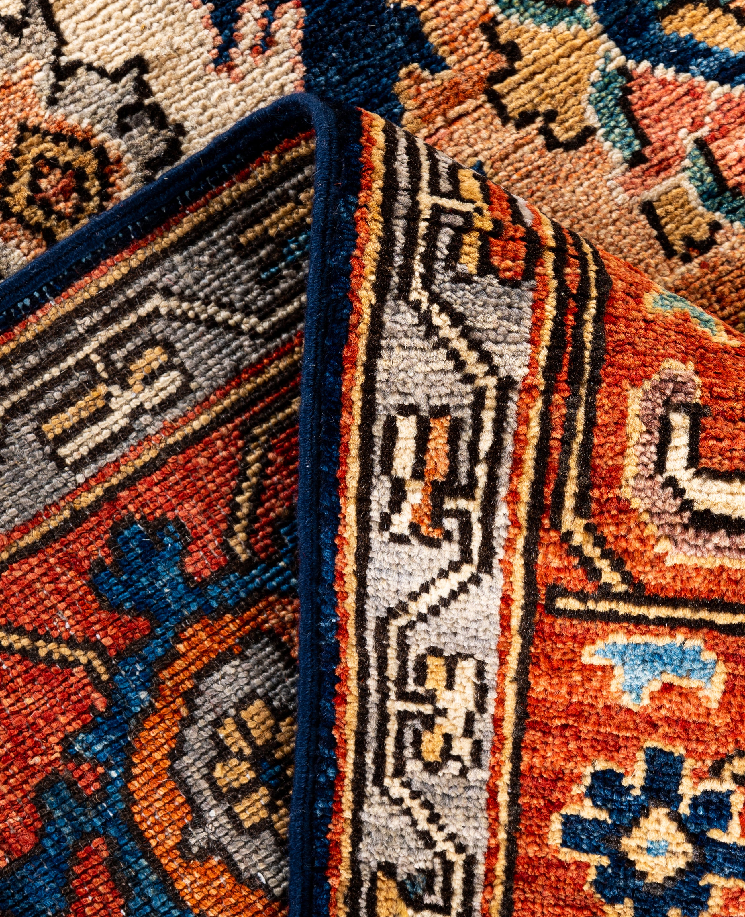 Serapi rugs are known for their bold, geometric designs and rich colors, often featuring a central medallion surrounded by intricate patterns. They typically use a warm, earthy color palette with deep reds, blues, ivory, and occasional greens. The designs emphasize large-scale motifs, including angular vines, leaves, and floral elements, giving the rugs a distinctive, almost architectural appearance. These rugs are hand-knotted and are prized for their durability and high-quality craftsmanship. Their unique aesthetic is attributed to a blend of traditional motifs with more refined, spacious compositions. They are highly sought after by collectors and interior designers for their elegance and timeless appeal.