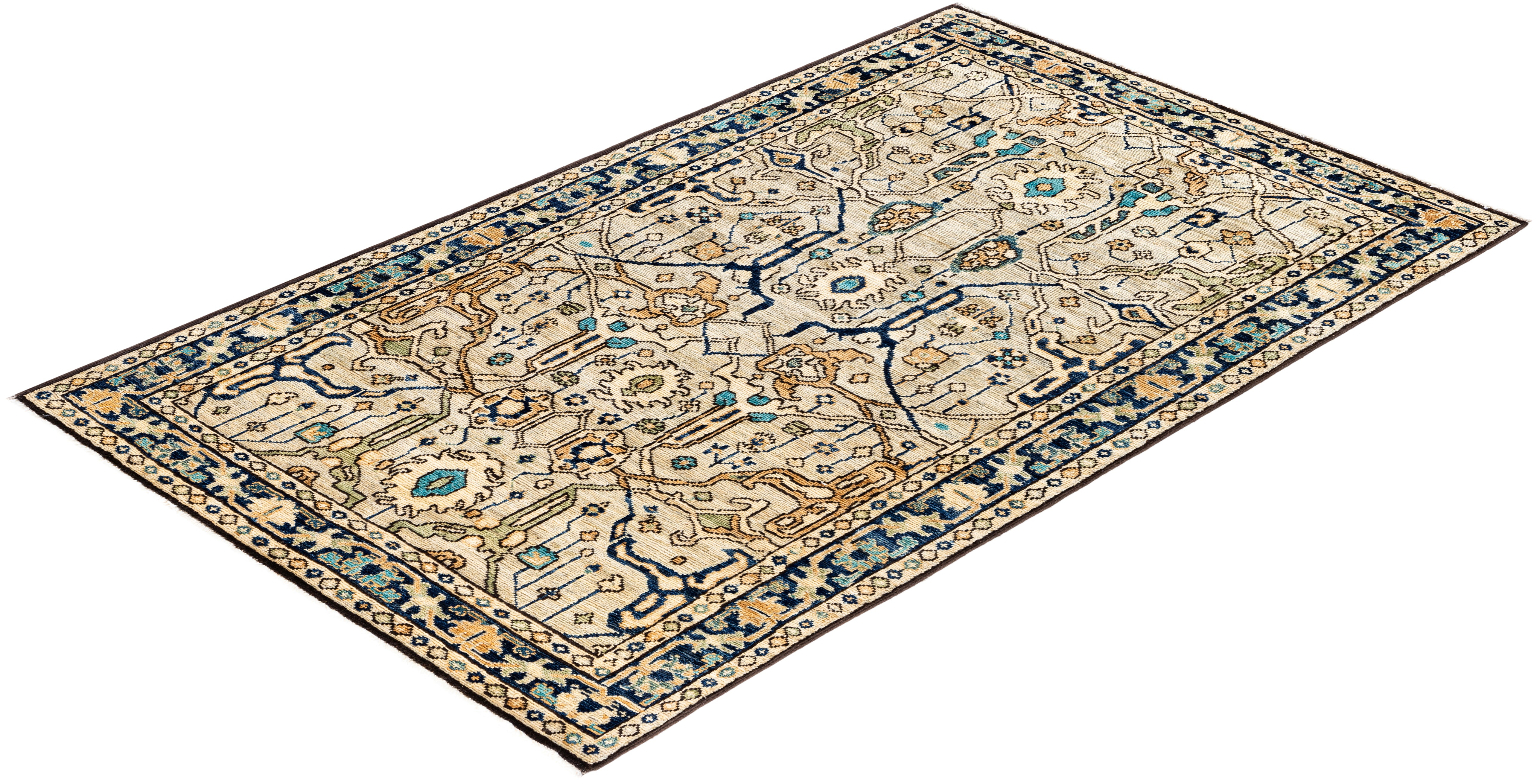 Serapi rugs are known for their bold, geometric designs and rich colors, often featuring a central medallion surrounded by intricate patterns. They typically use a warm, earthy color palette with deep reds, blues, ivory, and occasional greens. The designs emphasize large-scale motifs, including angular vines, leaves, and floral elements, giving the rugs a distinctive, almost architectural appearance. These rugs are hand-knotted and are prized for their durability and high-quality craftsmanship. Their unique aesthetic is attributed to a blend of traditional motifs with more refined, spacious compositions. They are highly sought after by collectors and interior designers for their elegance and timeless appeal.
