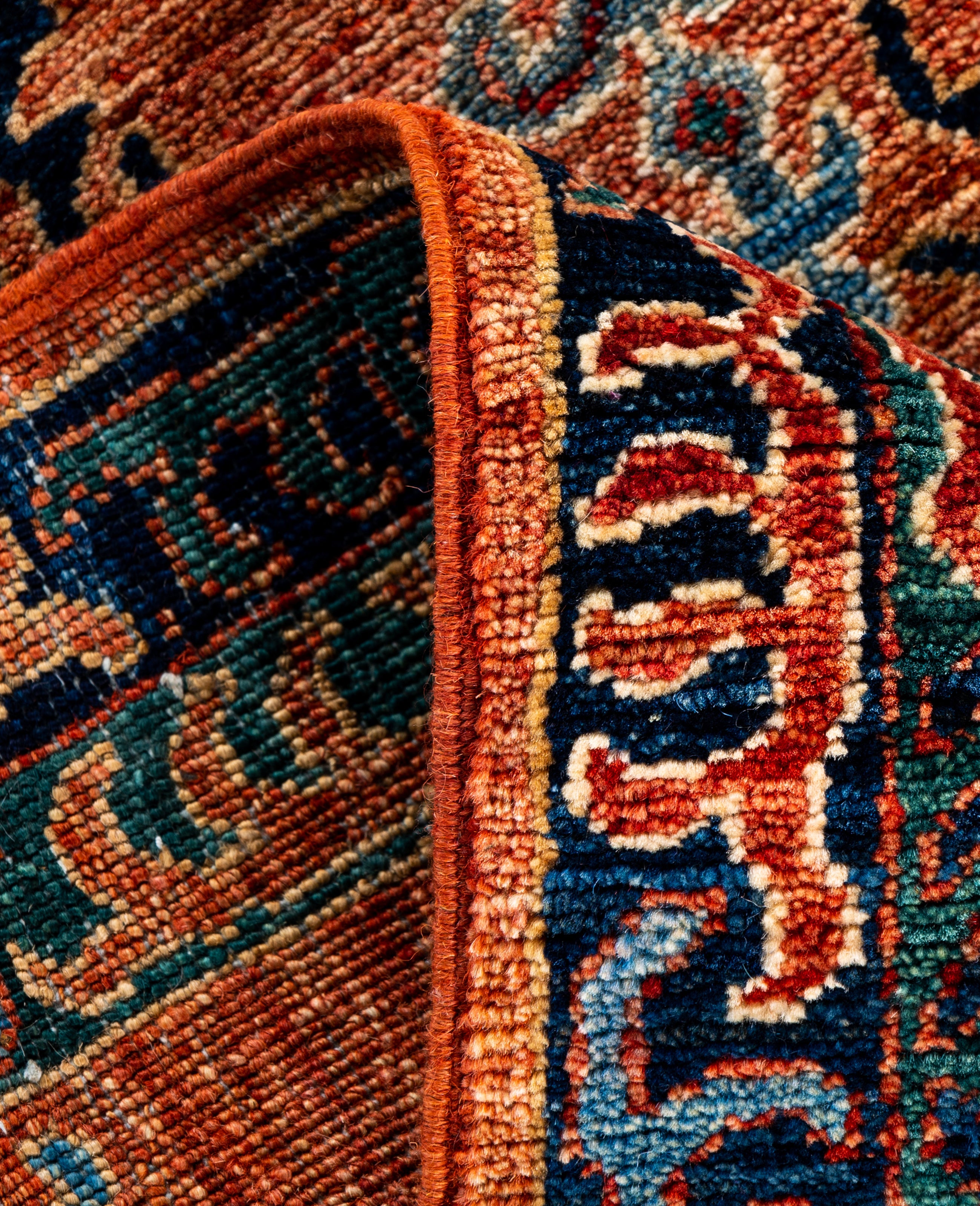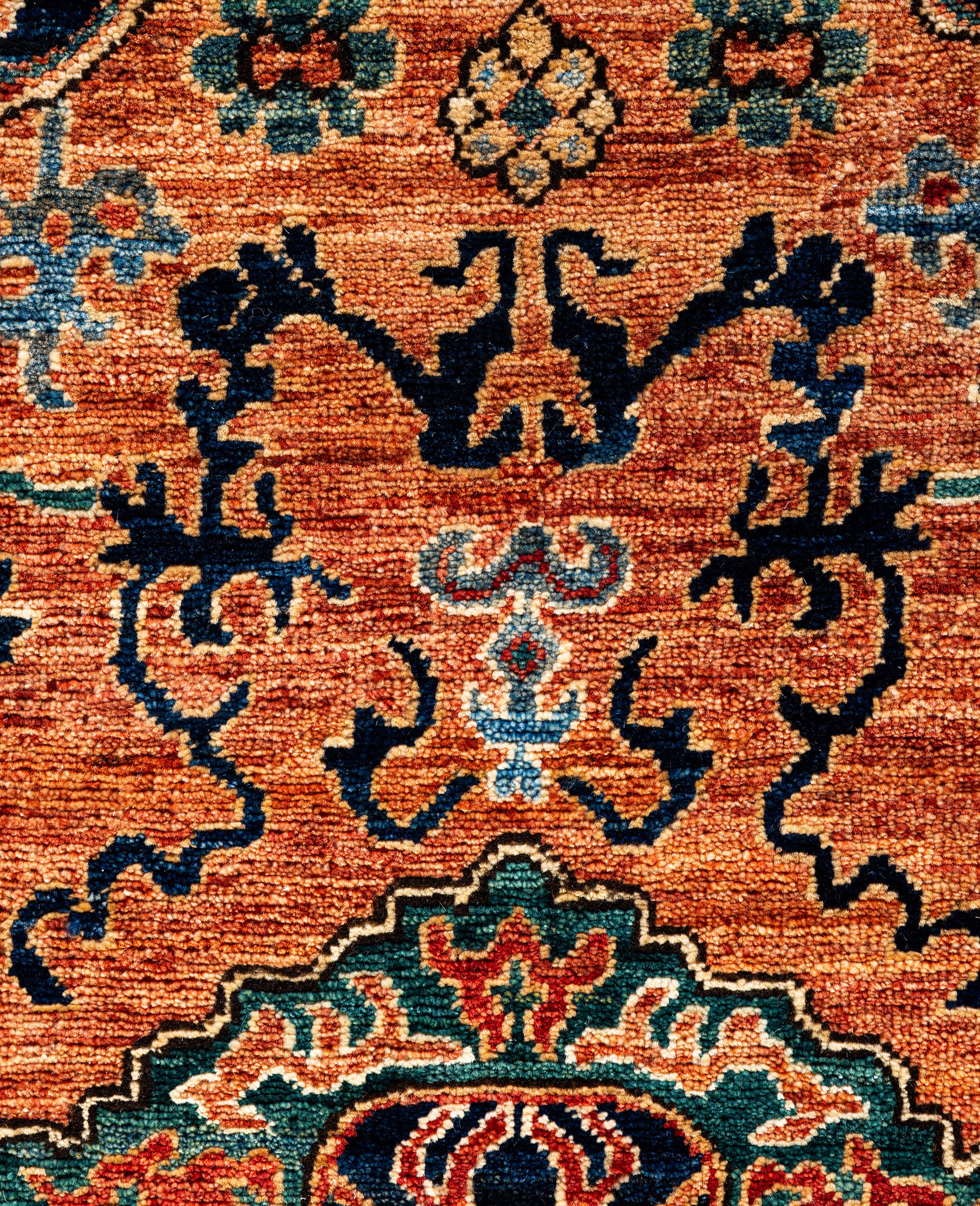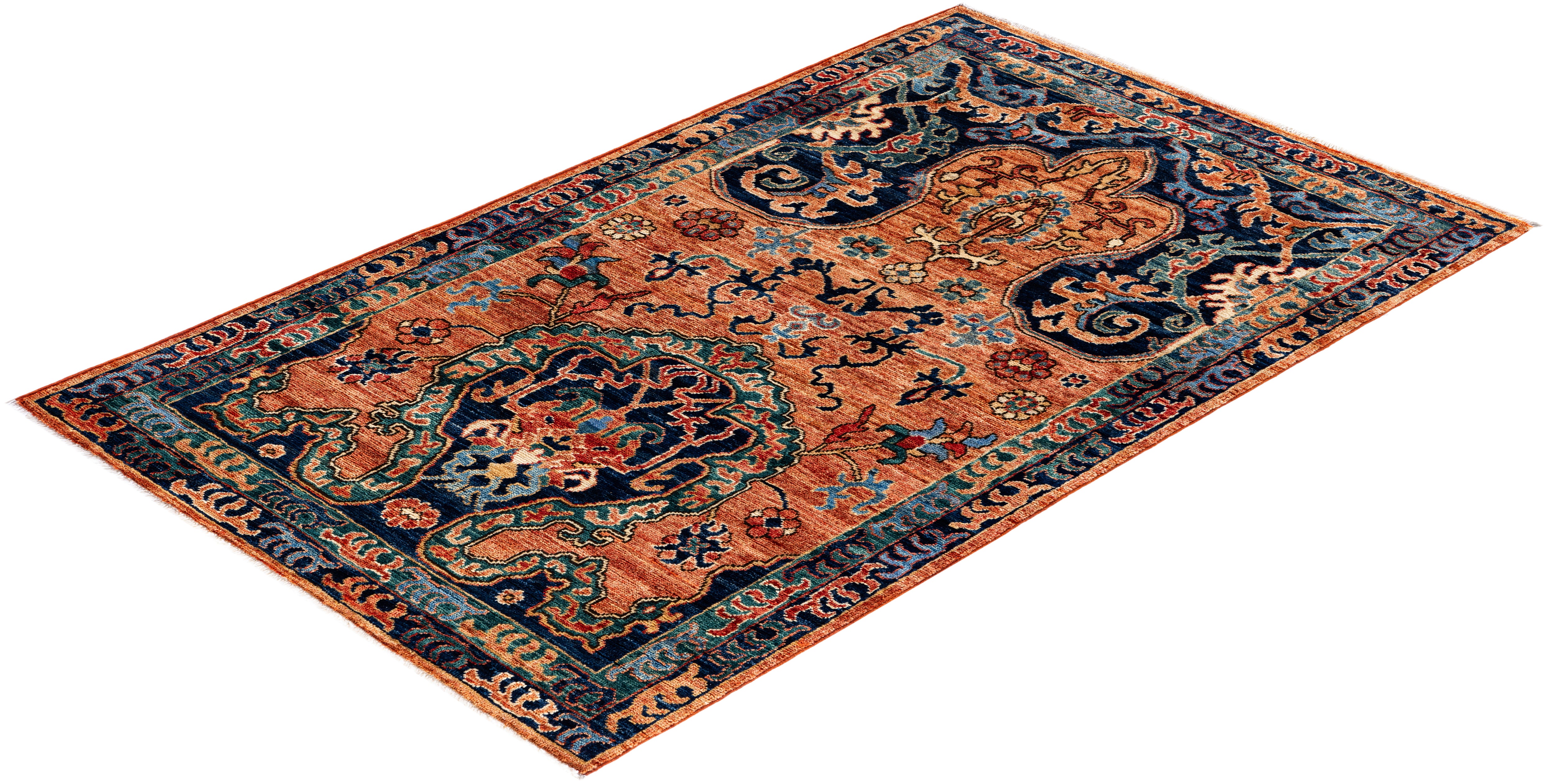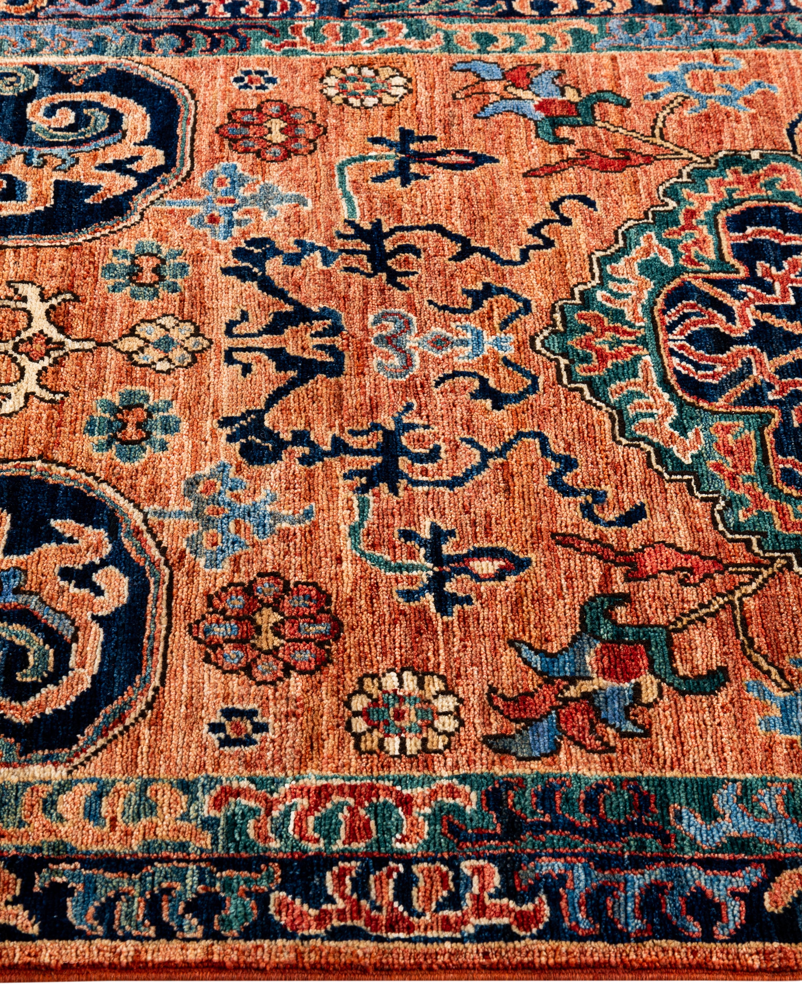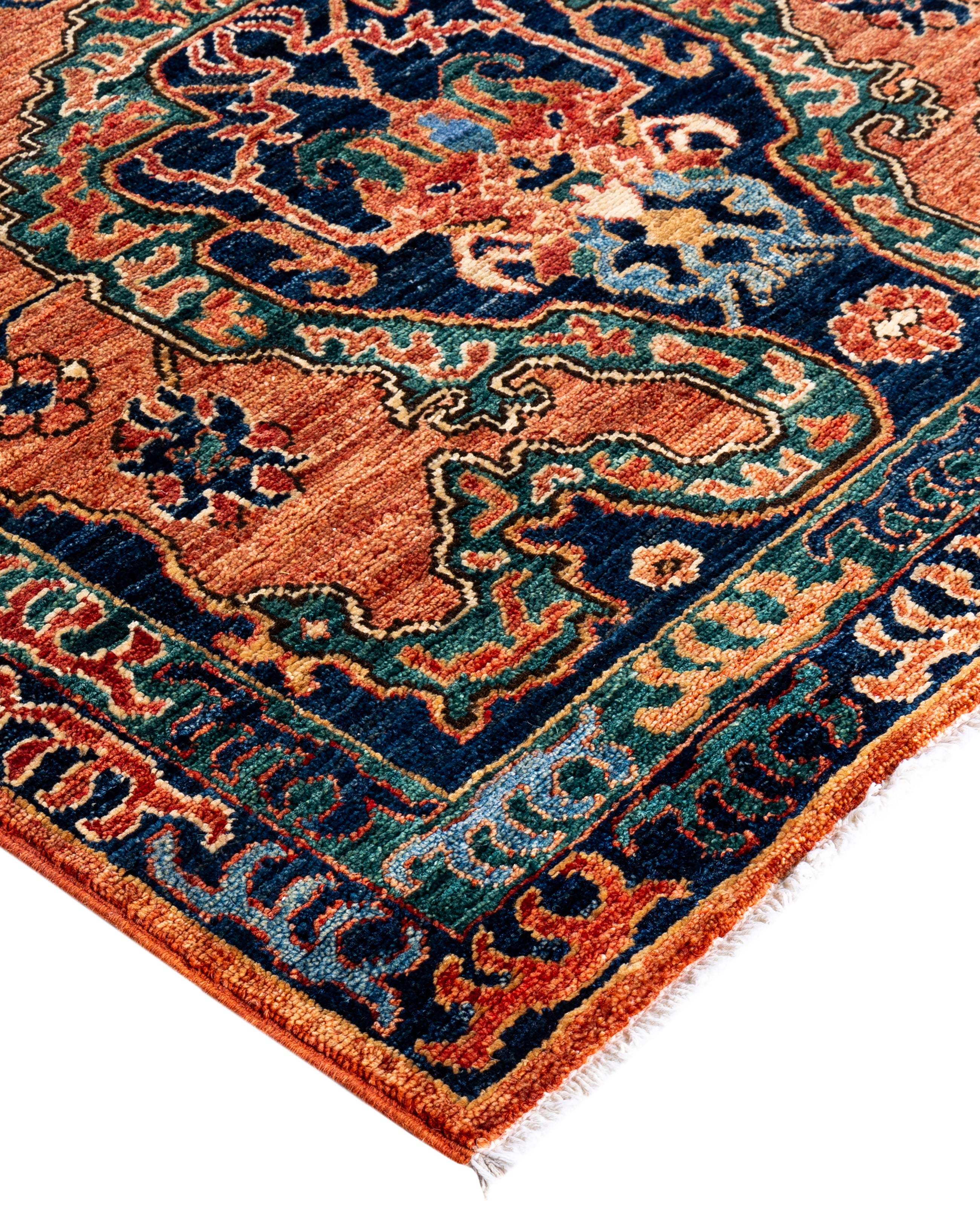 Serapi rugs are known for their bold, geometric designs and rich colors, often featuring a central medallion surrounded by intricate patterns. They typically use a warm, earthy color palette with deep reds, blues, ivory, and occasional greens. The designs emphasize large-scale motifs, including angular vines, leaves, and floral elements, giving the rugs a distinctive, almost architectural appearance. These rugs are hand-knotted and are prized for their durability and high-quality craftsmanship. Their unique aesthetic is attributed to a blend of traditional motifs with more refined, spacious compositions. They are highly sought after by collectors and interior designers for their elegance and timeless appeal.