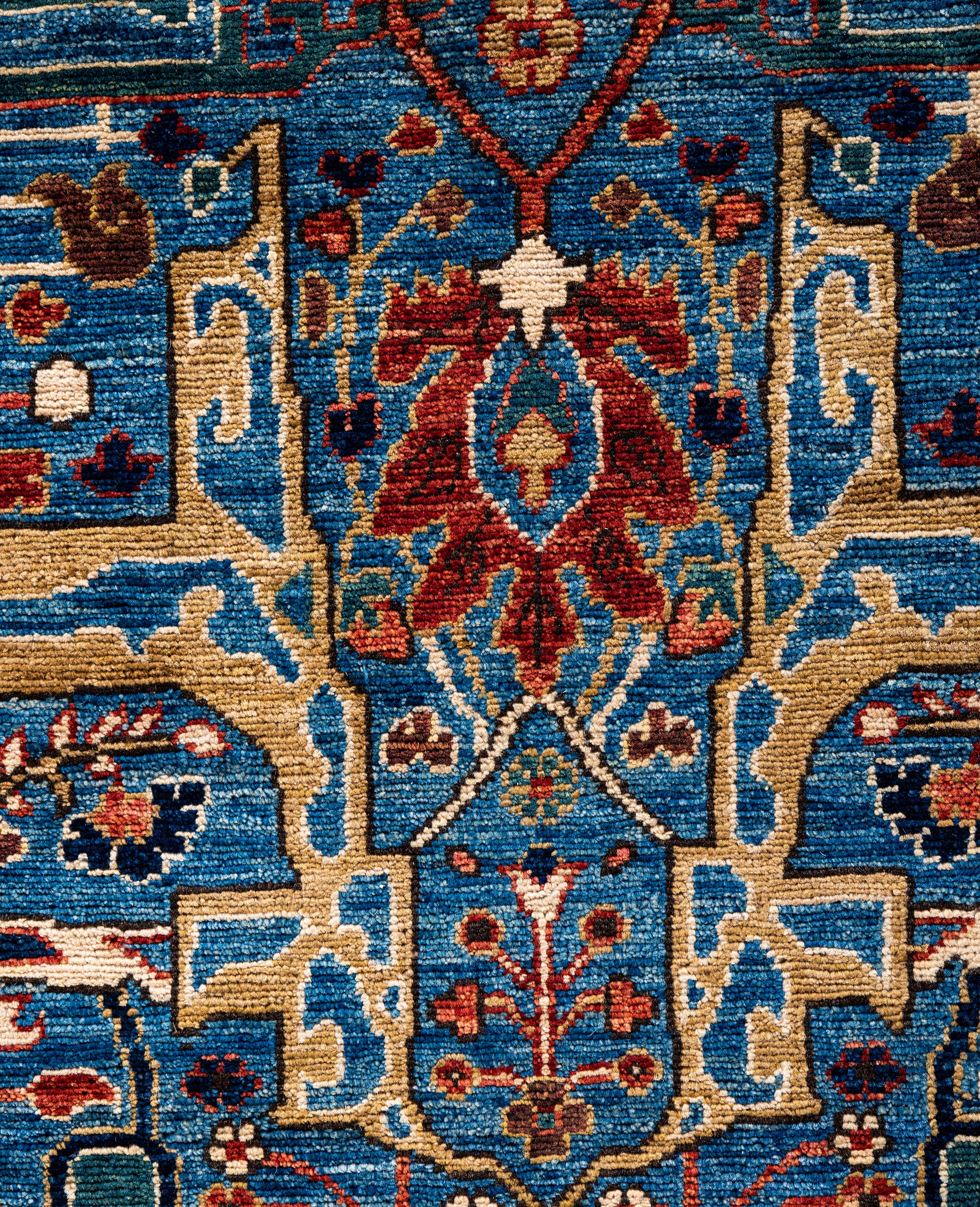 Serapi rugs are known for their bold, geometric designs and rich colors, often featuring a central medallion surrounded by intricate patterns. They typically use a warm, earthy color palette with deep reds, blues, ivory, and occasional greens. The designs emphasize large-scale motifs, including angular vines, leaves, and floral elements, giving the rugs a distinctive, almost architectural appearance. These rugs are hand-knotted and are prized for their durability and high-quality craftsmanship. Their unique aesthetic is attributed to a blend of traditional motifs with more refined, spacious compositions. They are highly sought after by collectors and interior designers for their elegance and timeless appeal.