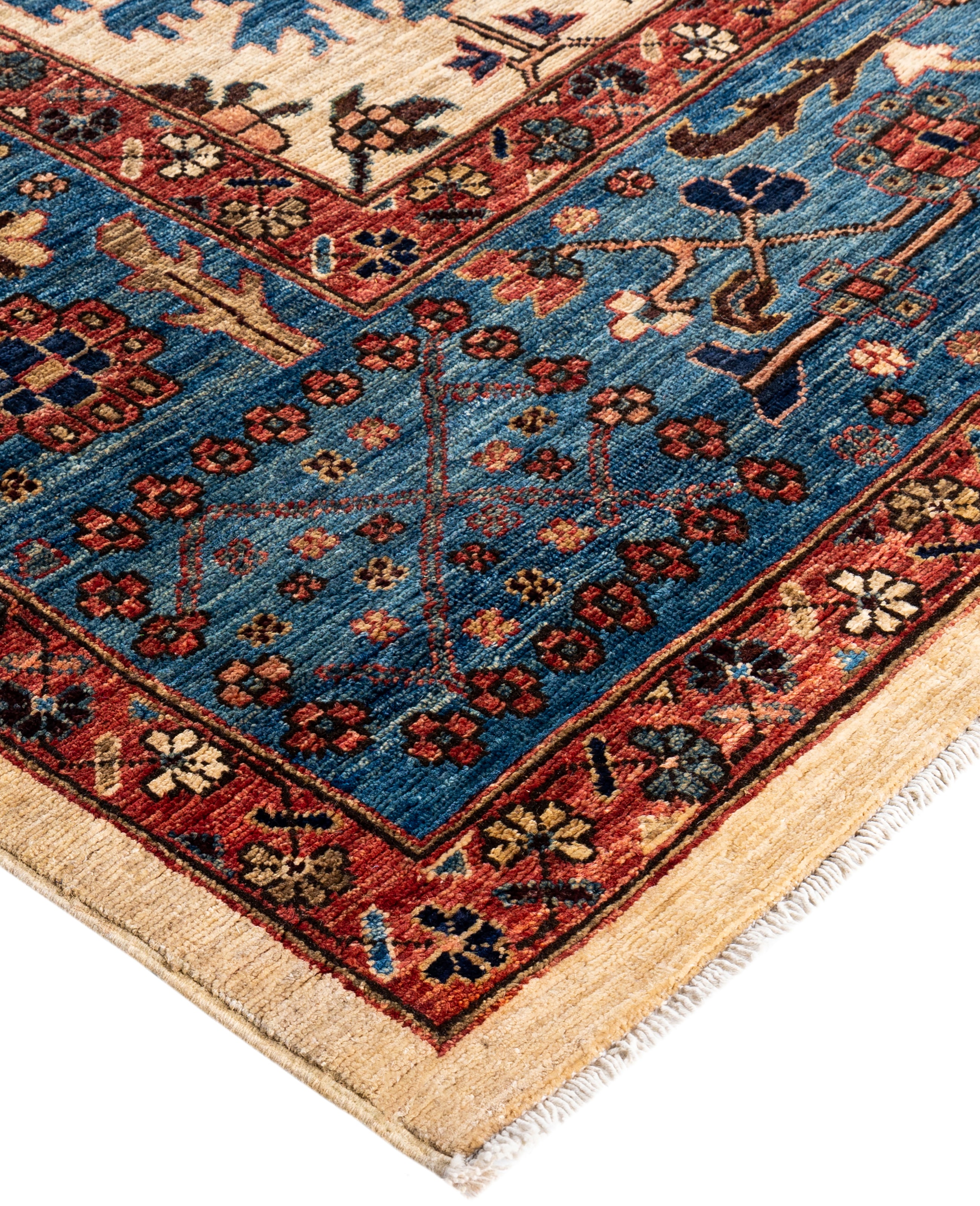 Serapi rugs are known for their bold, geometric designs and rich colors, often featuring a central medallion surrounded by intricate patterns. They typically use a warm, earthy color palette with deep reds, blues, ivory, and occasional greens. The designs emphasize large-scale motifs, including angular vines, leaves, and floral elements, giving the rugs a distinctive, almost architectural appearance. These rugs are hand-knotted and are prized for their durability and high-quality craftsmanship. Their unique aesthetic is attributed to a blend of traditional motifs with more refined, spacious compositions. They are highly sought after by collectors and interior designers for their elegance and timeless appeal.