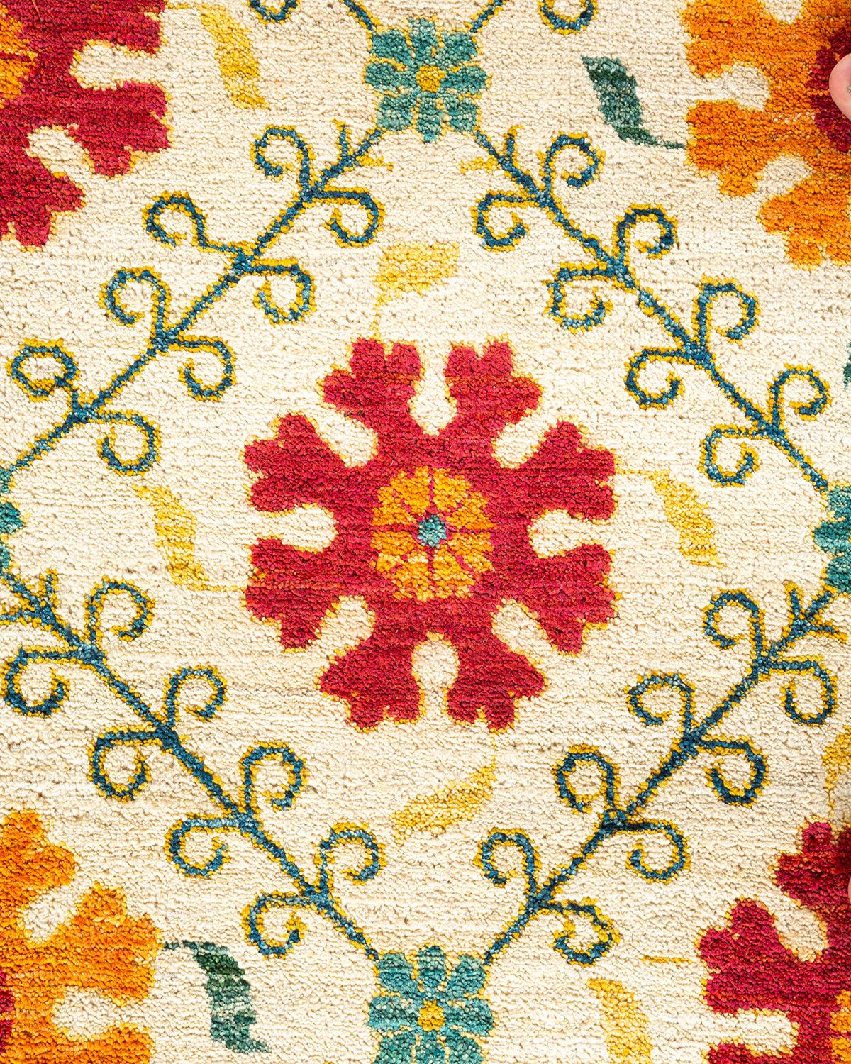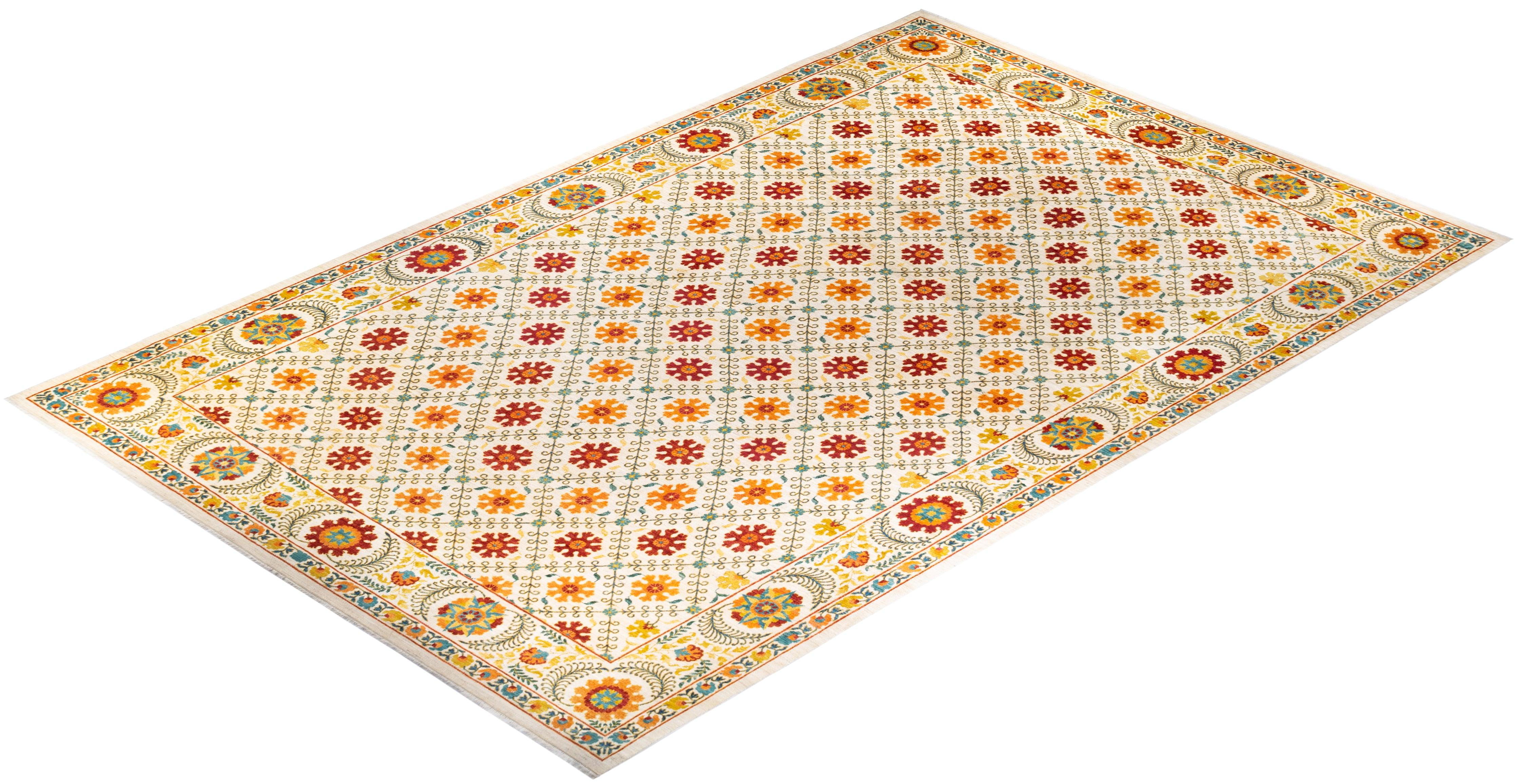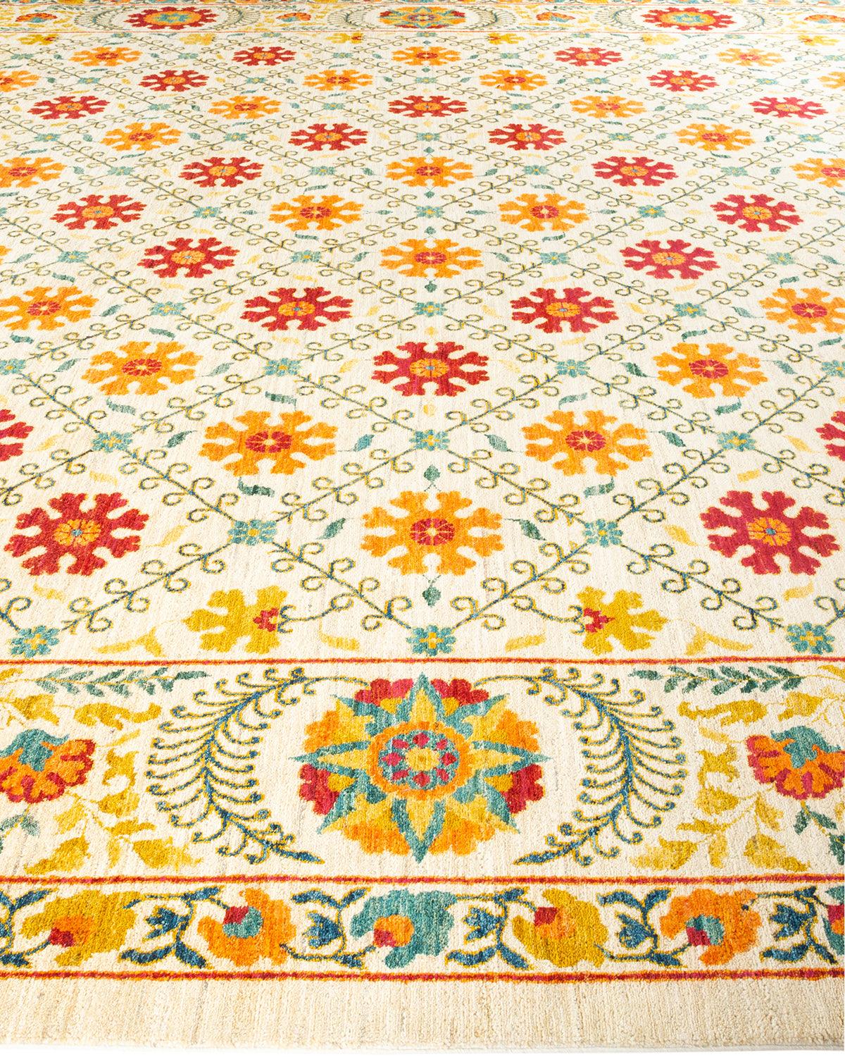 Contemporary Hand Knotted Suzani Floral Ivory Area Rug 12' 5" x 19' 1"