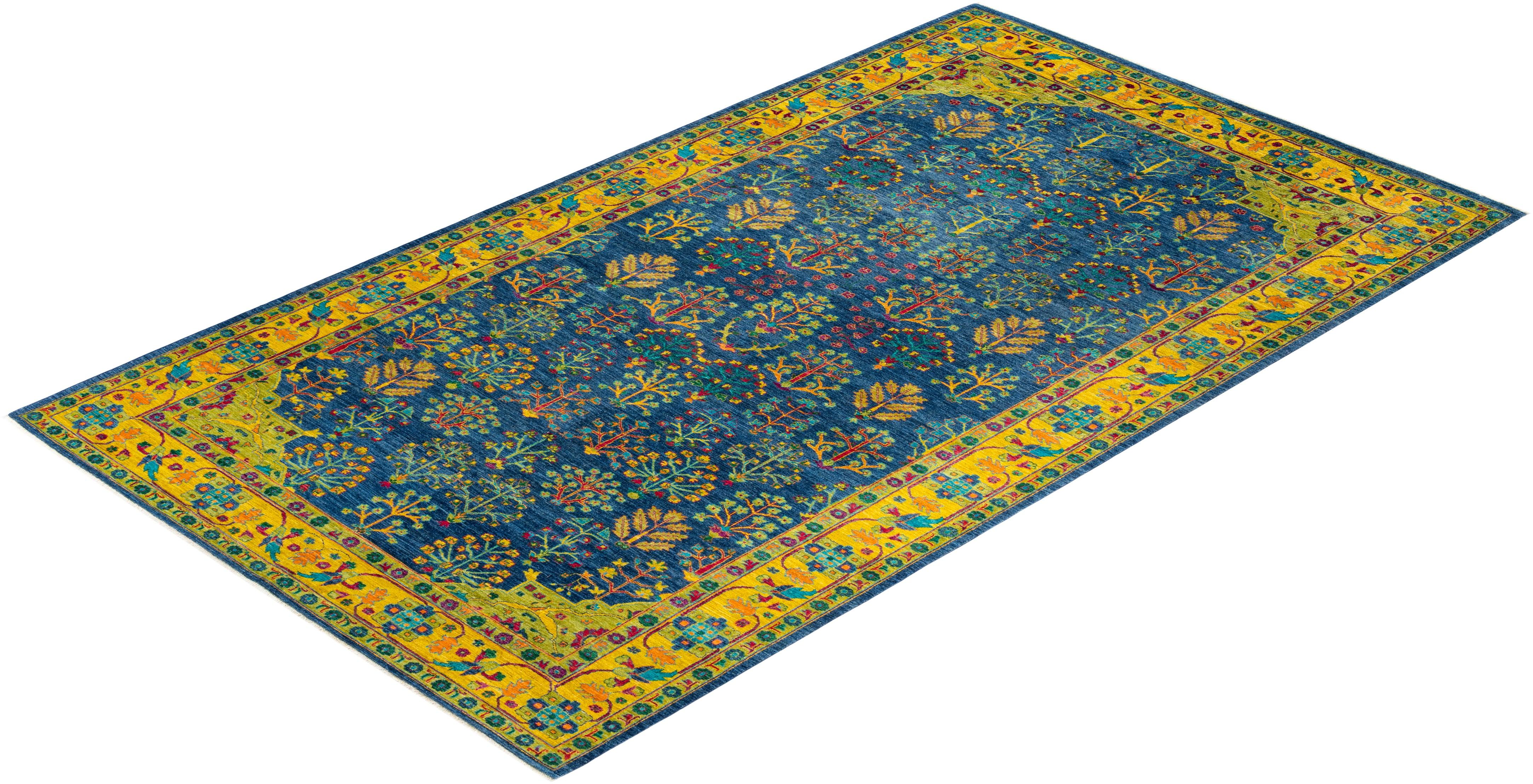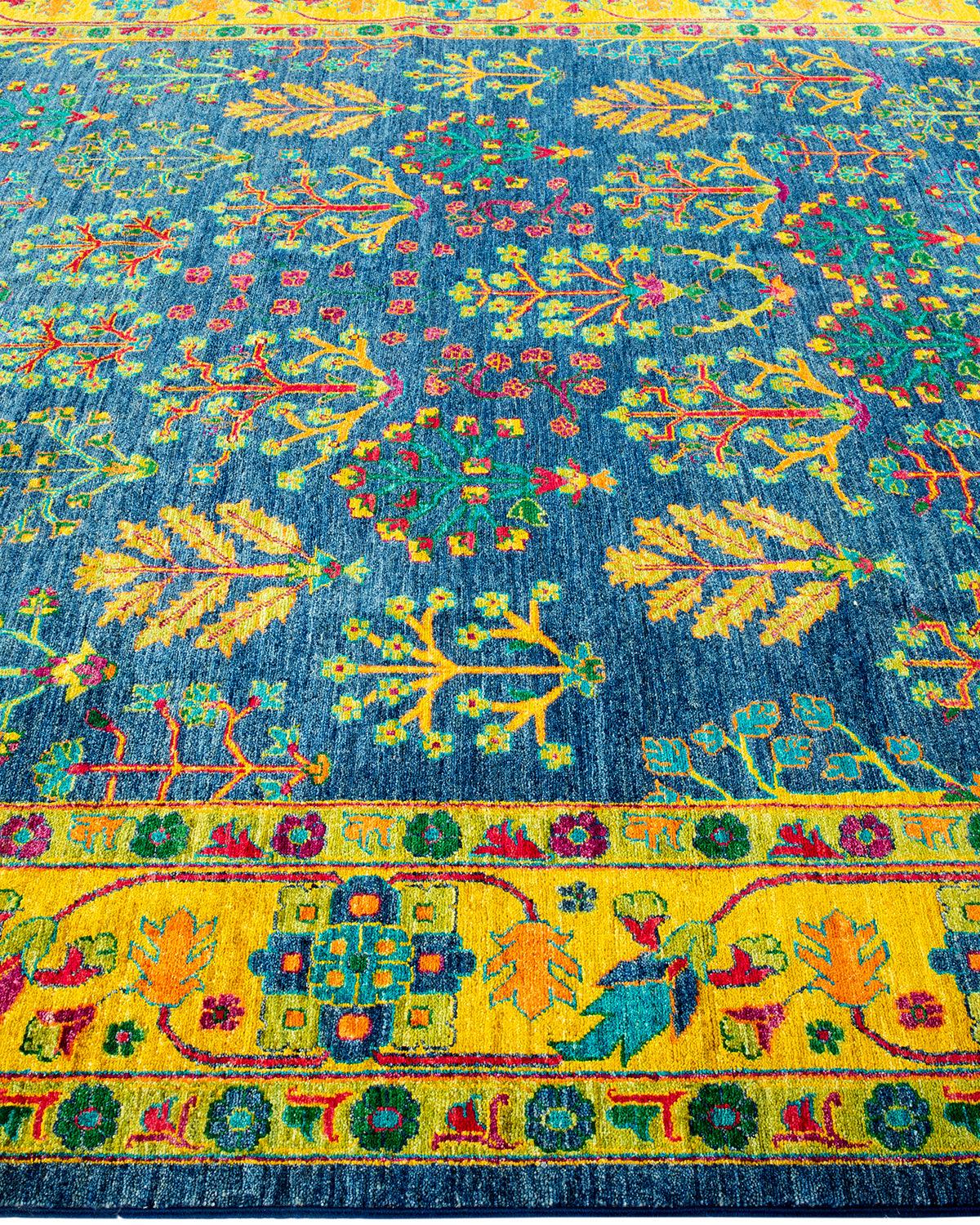 Contemporary Hand Knotted Eclectic Floral Blue Area Rug 13' 10" x 7' 10"