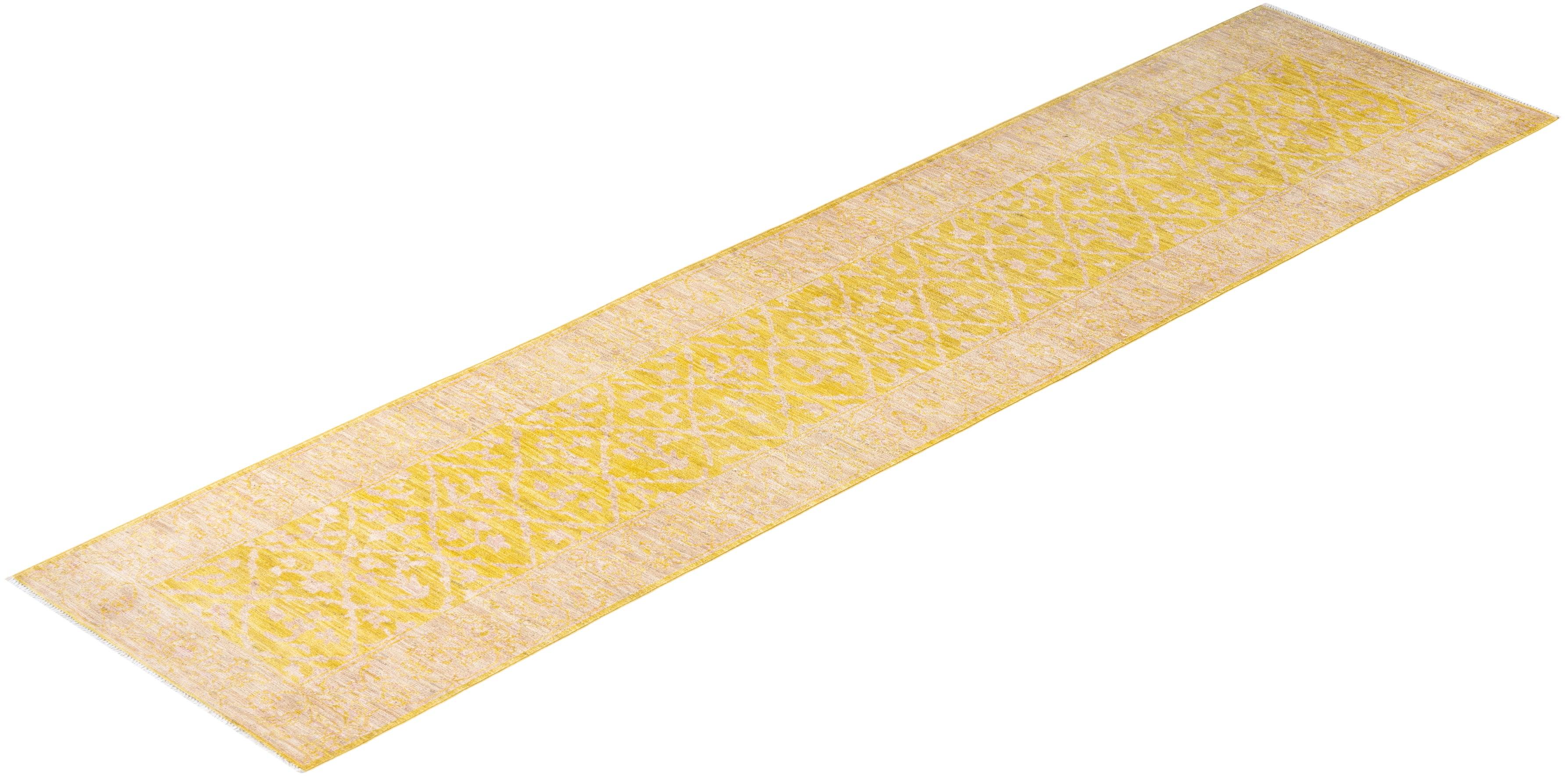 Contemporary Hand Knotted Eclectic Tribal Yellow Runner 2' 9" x 11' 8"
