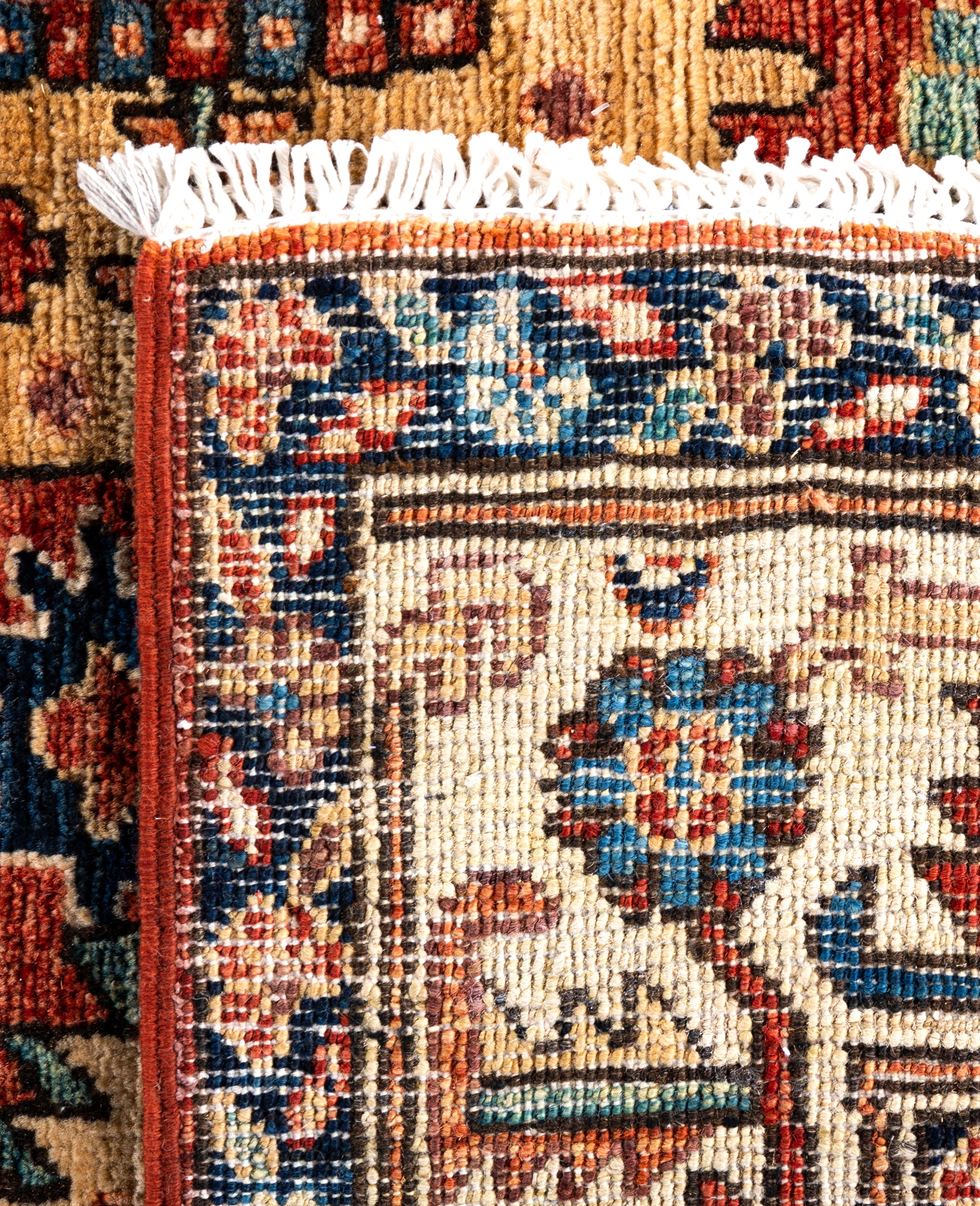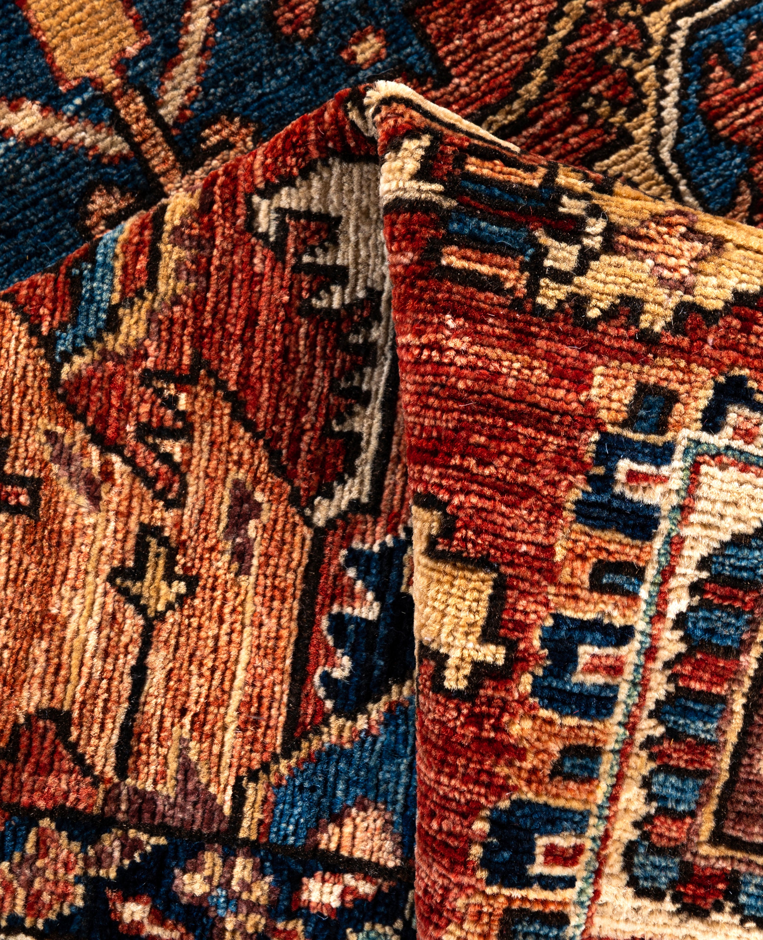 Serapi rugs are known for their bold, geometric designs and rich colors, often featuring a central medallion surrounded by intricate patterns. They typically use a warm, earthy color palette with deep reds, blues, ivory, and occasional greens. The designs emphasize large-scale motifs, including angular vines, leaves, and floral elements, giving the rugs a distinctive, almost architectural appearance. These rugs are hand-knotted and are prized for their durability and high-quality craftsmanship. Their unique aesthetic is attributed to a blend of traditional motifs with more refined, spacious compositions. They are highly sought after by collectors and interior designers for their elegance and timeless appeal.