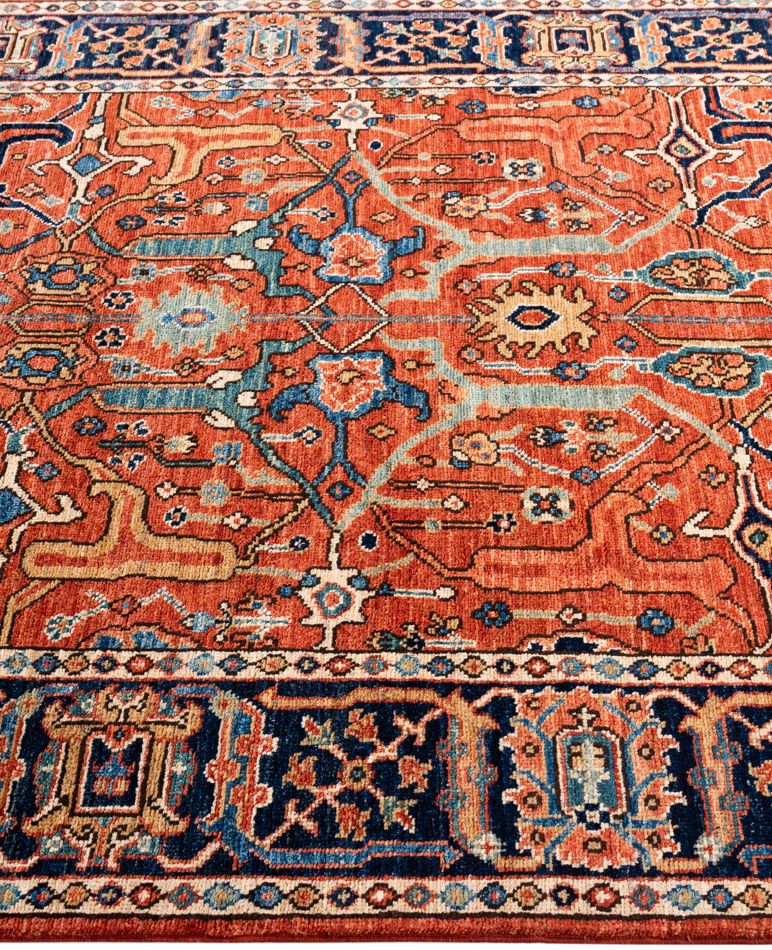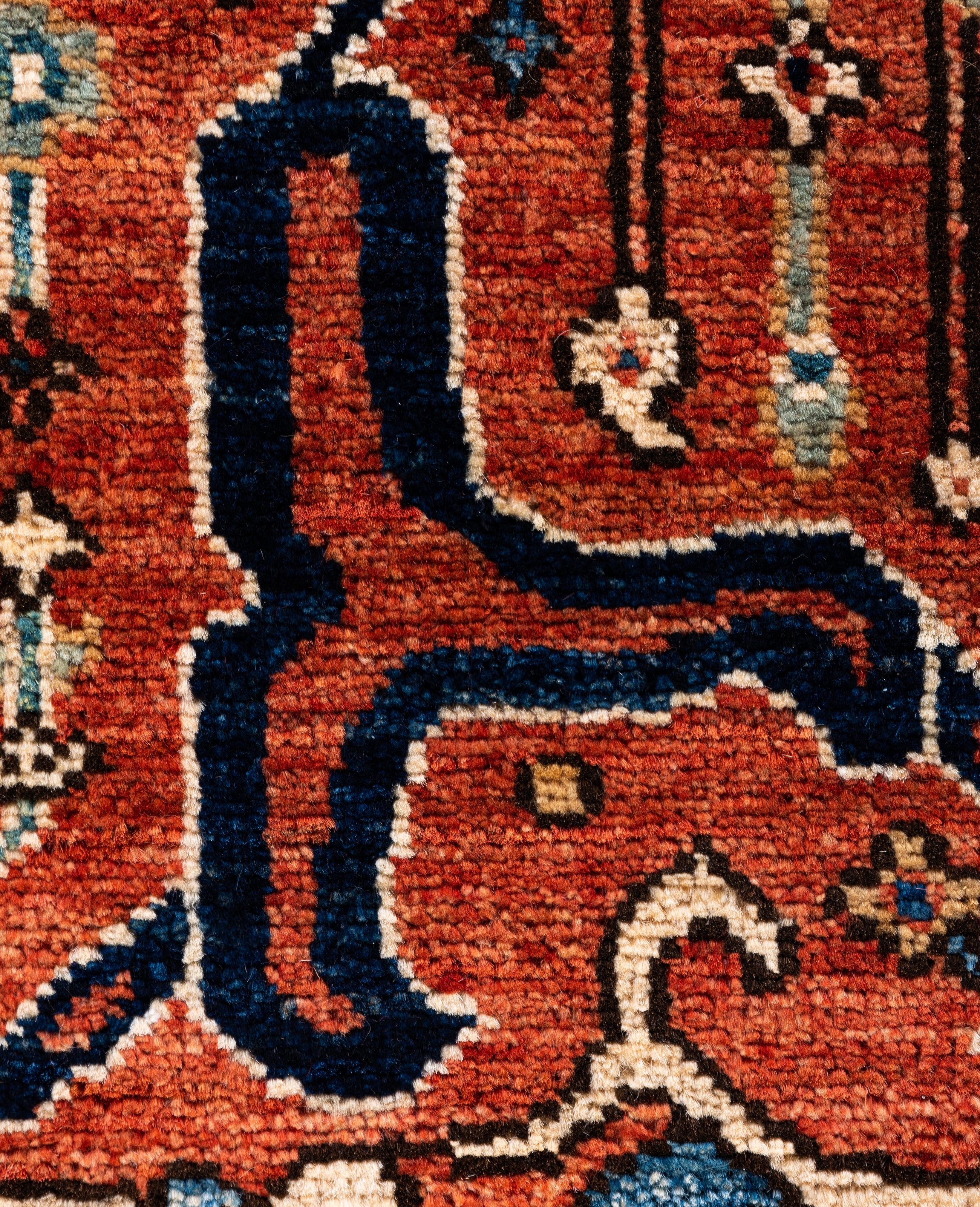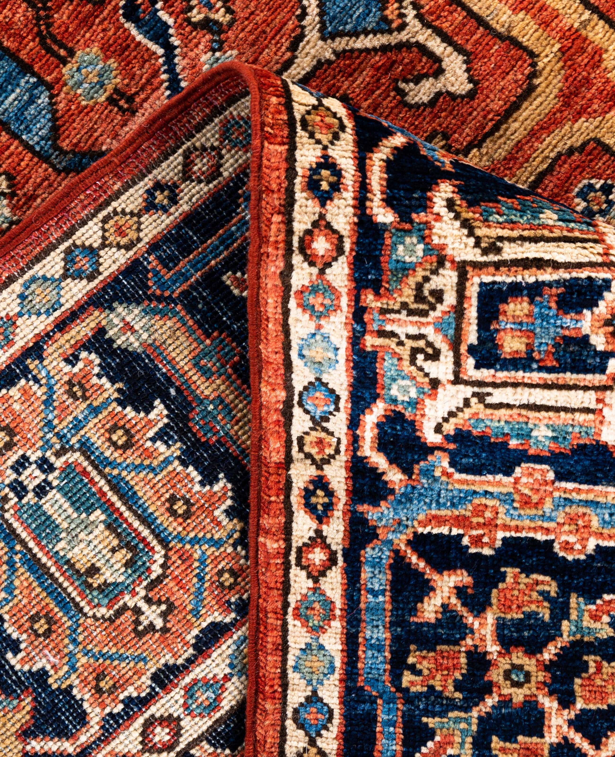 Serapi rugs are known for their bold, geometric designs and rich colors, often featuring a central medallion surrounded by intricate patterns. They typically use a warm, earthy color palette with deep reds, blues, ivory, and occasional greens. The designs emphasize large-scale motifs, including angular vines, leaves, and floral elements, giving the rugs a distinctive, almost architectural appearance. These rugs are hand-knotted and are prized for their durability and high-quality craftsmanship. Their unique aesthetic is attributed to a blend of traditional motifs with more refined, spacious compositions. They are highly sought after by collectors and interior designers for their elegance and timeless appeal.